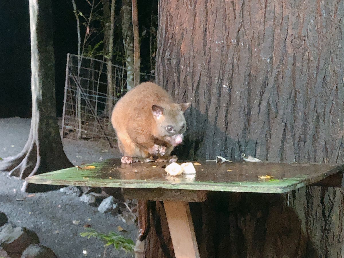 夜はオージービーフのステーキもあるBBQと、食後にはオーストラリアの紅茶と手作りケーキもいただきました。ご飯を食べていると森の中から野生のオポッサムがバナナを食べに来たり、ネズミがいたりとここでもケアンズならではの野生動物との出会いが。