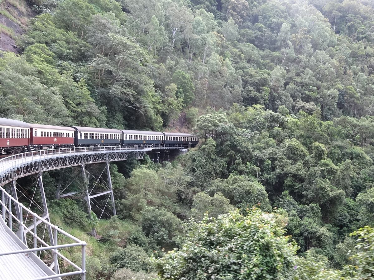 残念ながら天気が悪く、せっかくのスカイレールはほとんど何も見えませんでした。その後雨が上がったおかげで、キュランダ列車はきれいな景色が良く見えてよかったです。特に写真スポットでは停車してくれるので、外に降りて景色を楽しむこともできました。