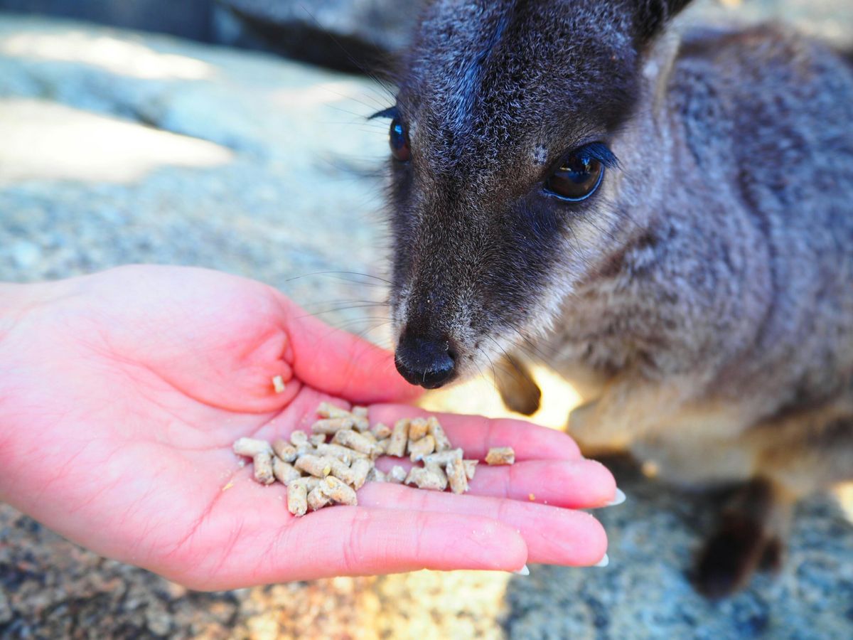 ロックワラビーは、本当に可愛らしくて、癒されました。袋に赤ちゃんがいるワラビーちゃんも数匹いましたよ。みんな人に慣れているからか、すぐに寄って来てくれて、エサをあげたり、触れたりすることが出来ました。エサを持つ手をぎゅっと握って食べる姿は本当に可愛いので、絶対お勧めです。
