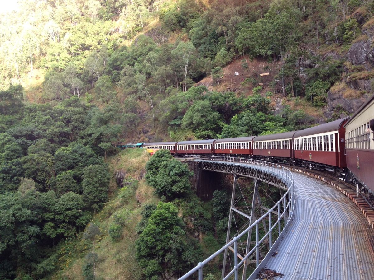 鉄道は11両編成であり、ケアンズ行きは11両目が先頭でした。自身は10両目(チケットは11両目でしたが、10両目に移動させてもらえました)に座りました。渓谷の写真スポットも綺麗に後方を見ることができ、とても良い旅でした。