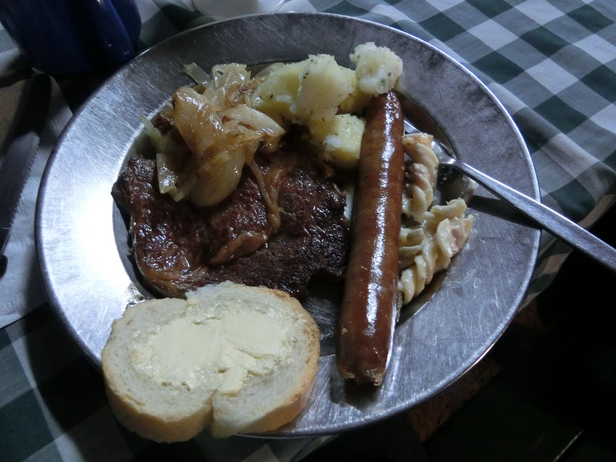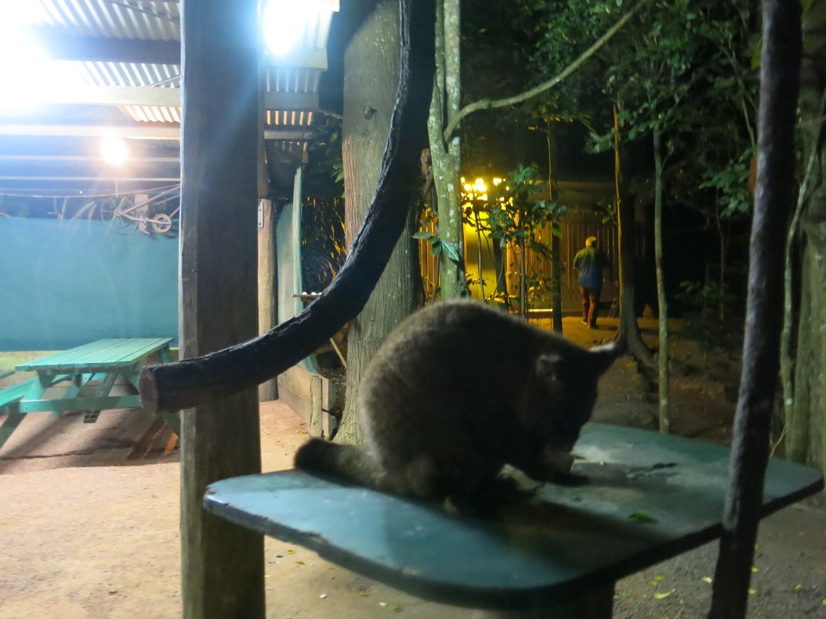 夜ご飯は運転手のリンさんお手製BBQ。まずは、ワニ肉とカンガルー肉の試食。どちらも食べやすくて、おいしいお肉でした。メインのオージービーフは大きい。サラダもグリーンサラダやポテト、パスタ等、後はパンにかぼちゃのスープ、ソーセージ。大満足のBBQ、お腹いっぱいになりました。食事が終わる頃には、ポッサムが集まってきていました。赤ちゃんも来てくれましたよ。ポッサムを眺めながら、デザートに紅茶とクッキーをただきました。デザートの後は、夜のお散歩に行きました。すごく低い木の枝で寝ている小鳥を見つけました。ライトを当ててもぐっすりで、かわいかったです。