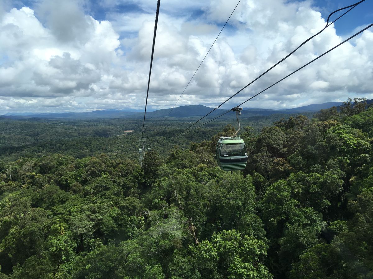 スカイレールは6人乗りのゴンドラです。どこの席からもまあまあですが、最初は後ろの席、乗り換え後は前側がおすすめです。広大な原生林を上から眺められ最高です。また途中駅でも短い散策ができ、ジャングルを間近でも楽しめます。滝も見れます。キュランダ直前でスコールがあり、視界がわるくなってしまいましたが、満足できました。スコールがあるとちょっと寒いので、羽織るものがあった方がよいです。