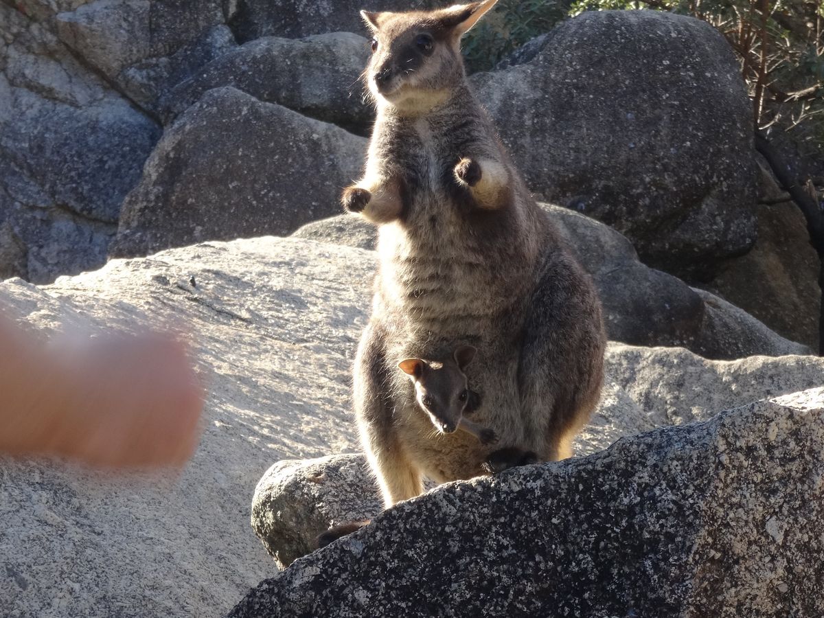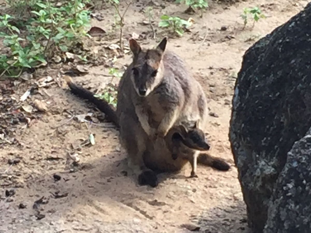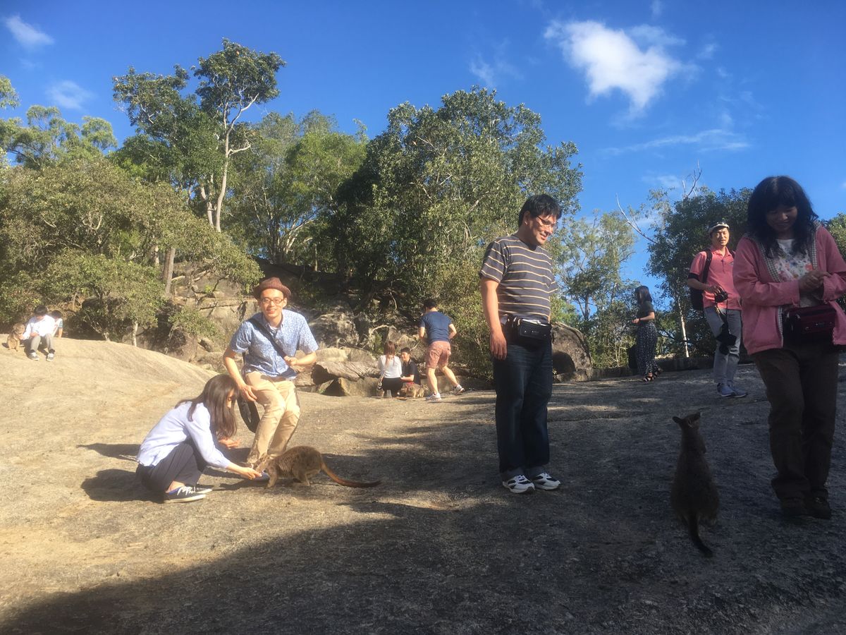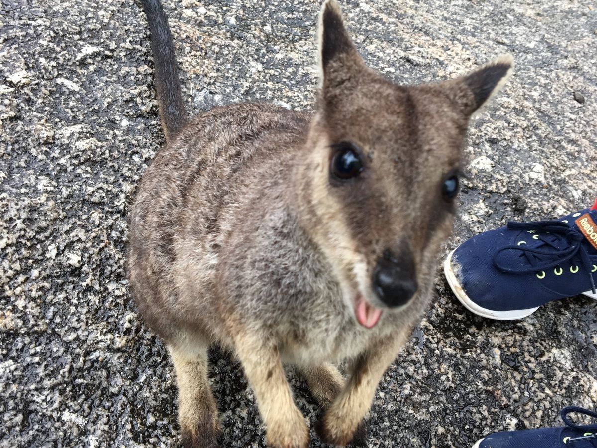 自然の生き物が相手なのと、雨だった事もあり、期待半分でしたが、見たかった動物に会う事ができて、ラッキーだったと思います。ロックワラビーにもたくさん囲まれて、もっともっとエサをあげたい、連れて帰りたいと思いながら、後ろ髪をひかれつつ帰ってきました。ずっと向こうの岩の上でこちらの様子を見ていた子も、とても気になりました。