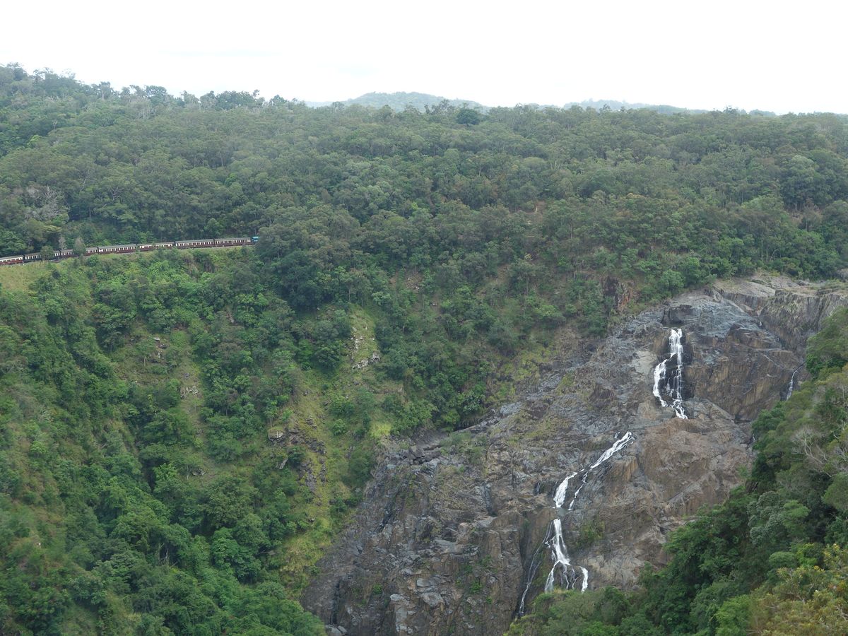 行きはスカイレール、帰りはキュランダ鉄道でした。どちらも素晴らしい眺めですが、キュランダ鉄道のほうが乗っている時間長く、眺望がすばらしいです。鉄道に乗るのなら、真ん中よりやや後方がベストです。山沿いにカーブするとき、先頭車をいれて、前方車両のカーブがきれいにとれます。よく写真に出てくるあのシーンがとれます。キュランダ村はどこにでもある観光村で面白くありません。時間つぶし程度のものです。