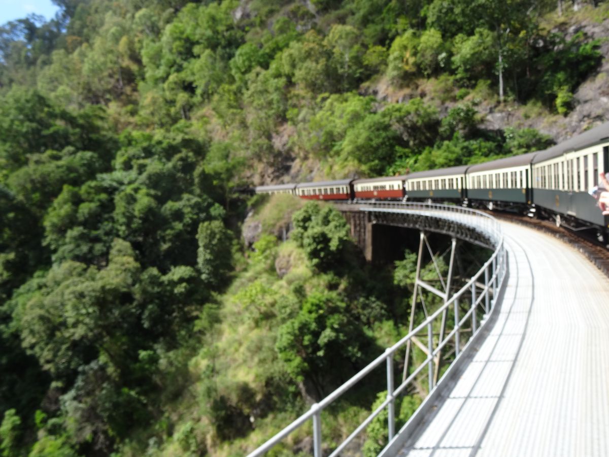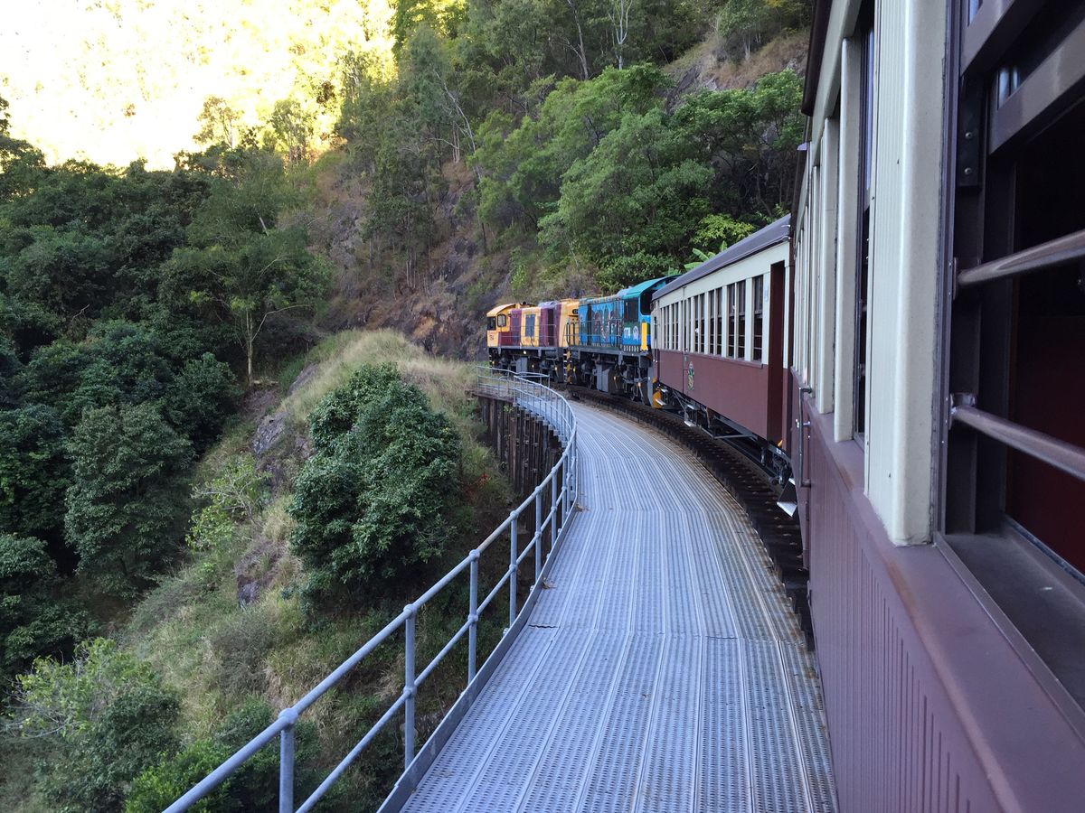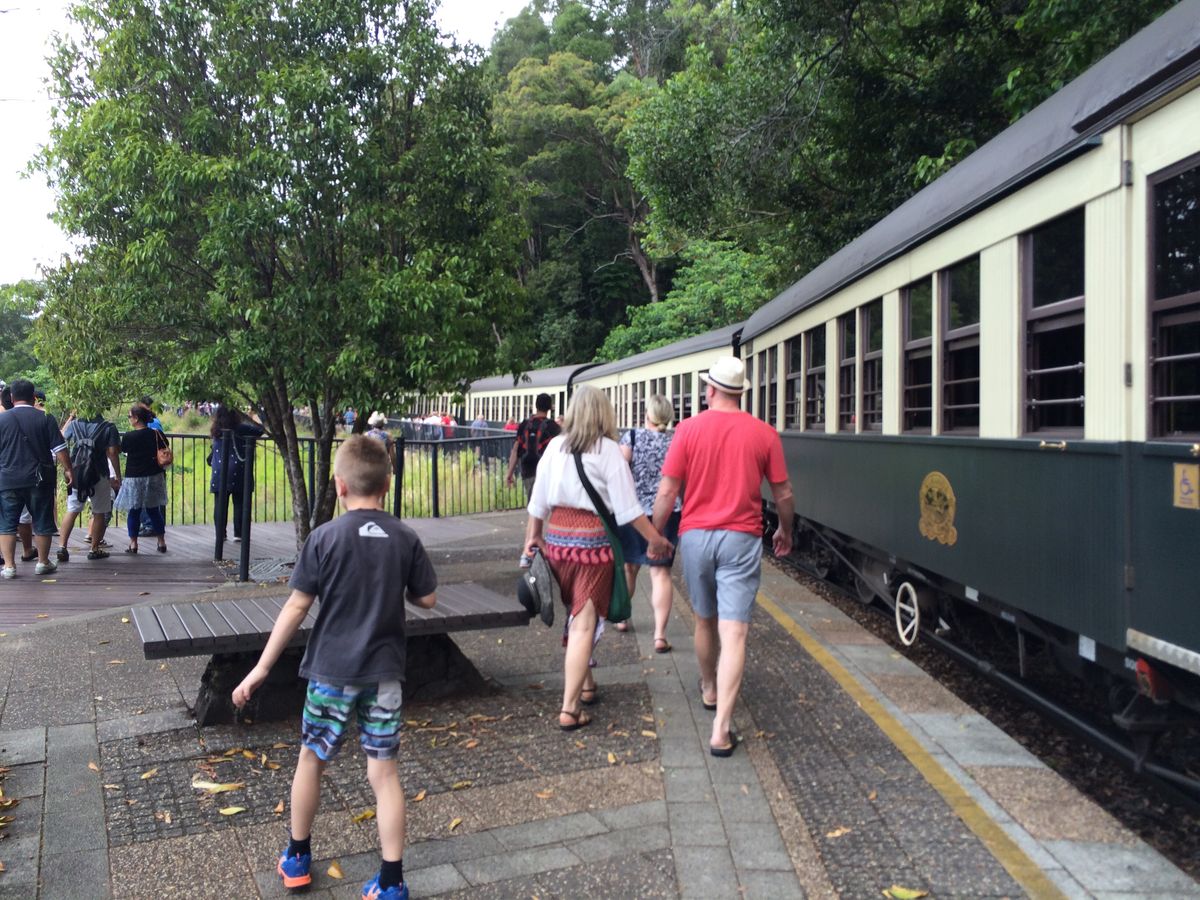 行きはキュランダ高原列車。子供はおおはしゃぎ。観光列車でもあるので、運転士や乗務員も親切だし、ポイントのたびにゆっくり走るので、写真もばっちり撮れました。