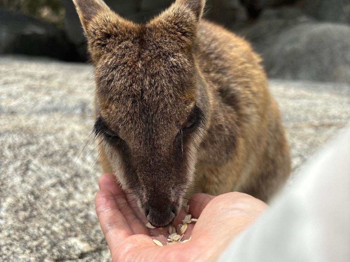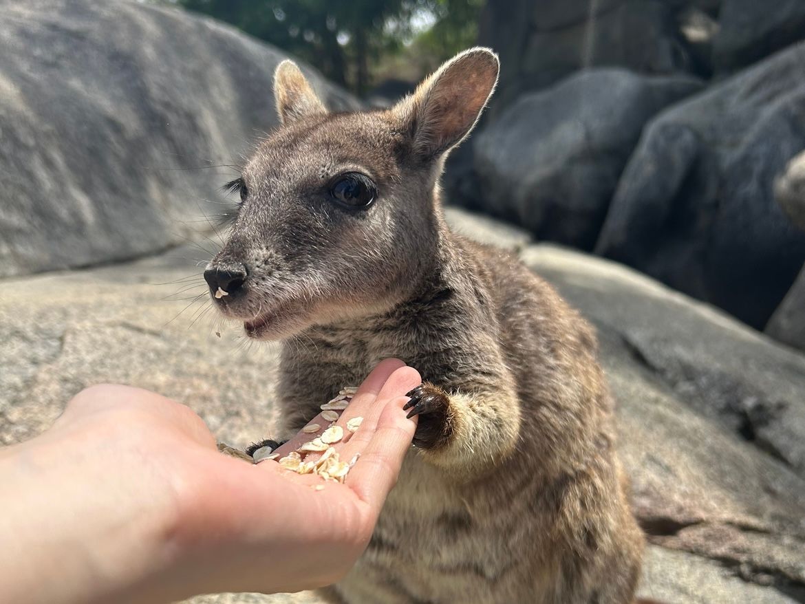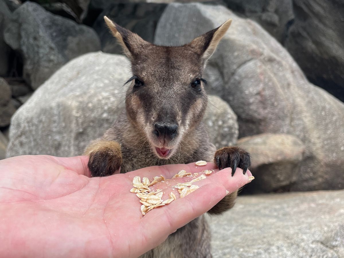 野生のロックワラビーが自分の手のひらに乗せたエサを食べに来ます。シェーンさんが声を掛けると警戒しながらも近づいてきてくれます。ペアのワラビーが毛づくろいしている姿はとても可愛くて、とても貴重な体験でした。