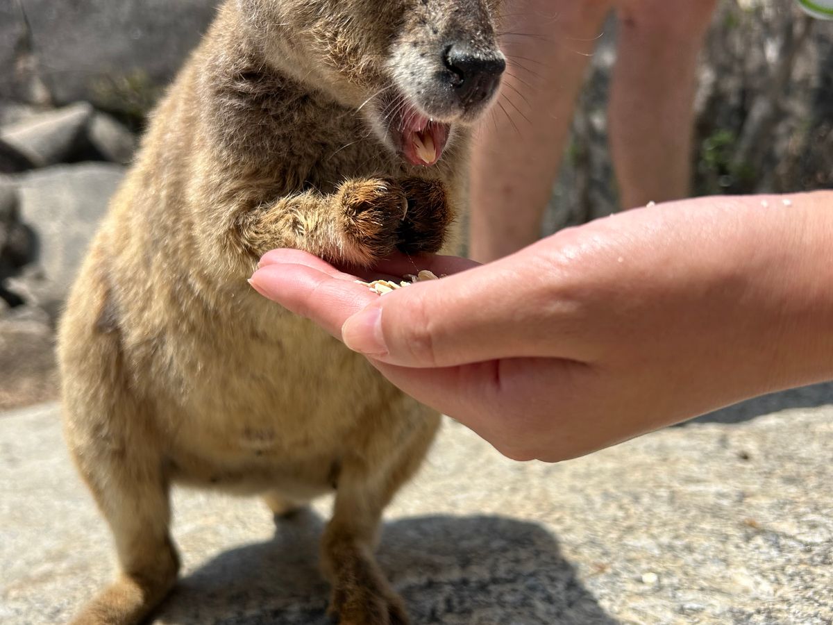 このツアーのハイライトは個人的にはワラビーかなと思います。岩場にいるワラビーたちがぴょこぴょこ来てくれてエサやりをするのですが、本当にとってもかわいい!!袋に子どものいるお母さんワラビーもいました。何匹ものワラビーさんと触れ合うことができます。