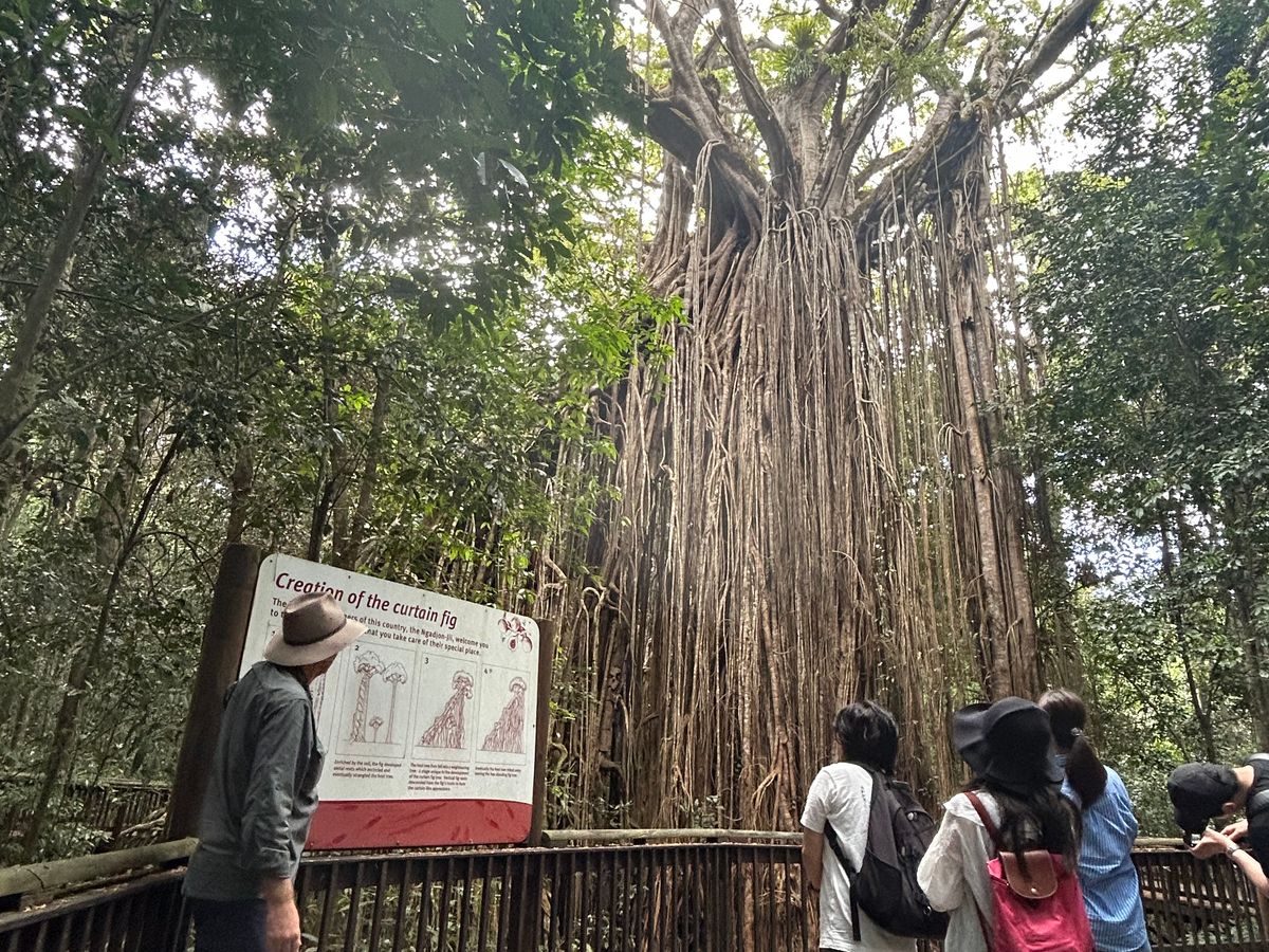 次にアサートン高原の景色をドライブで見ながら、フィグカーテンツリーを見学。溶岩の岩がゴツゴツした地域だから牧場にせずそのまま残ったエリアとのこと。ツリーの存在感がすごいです。