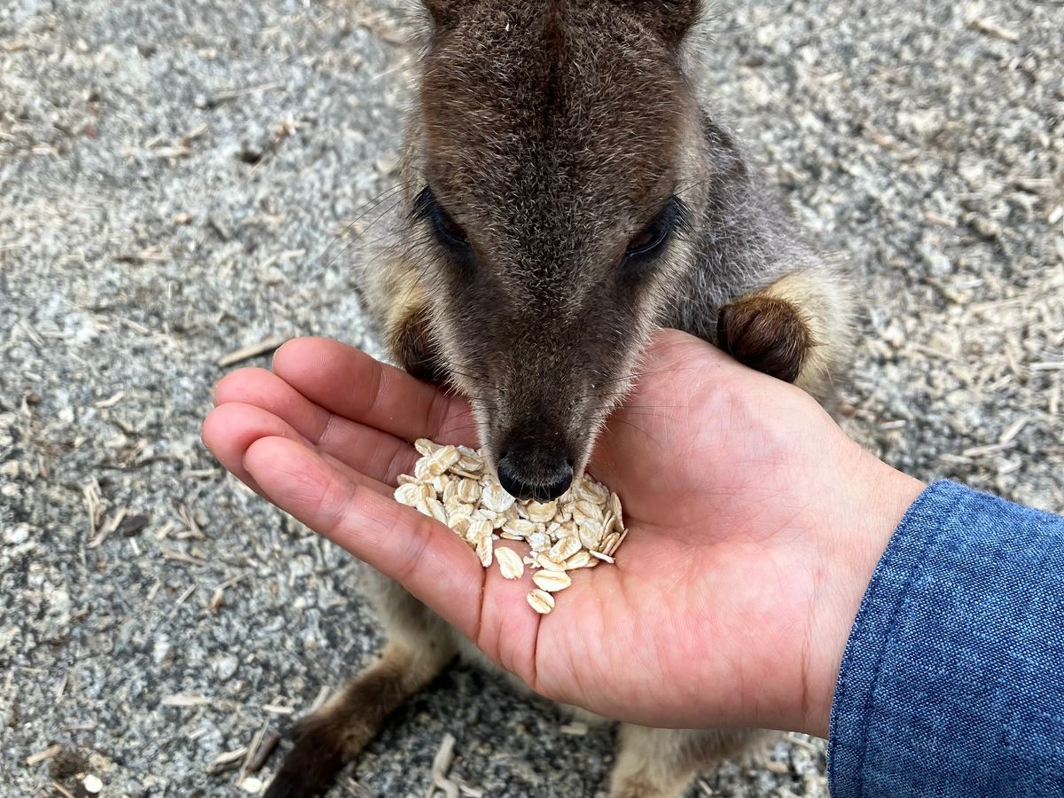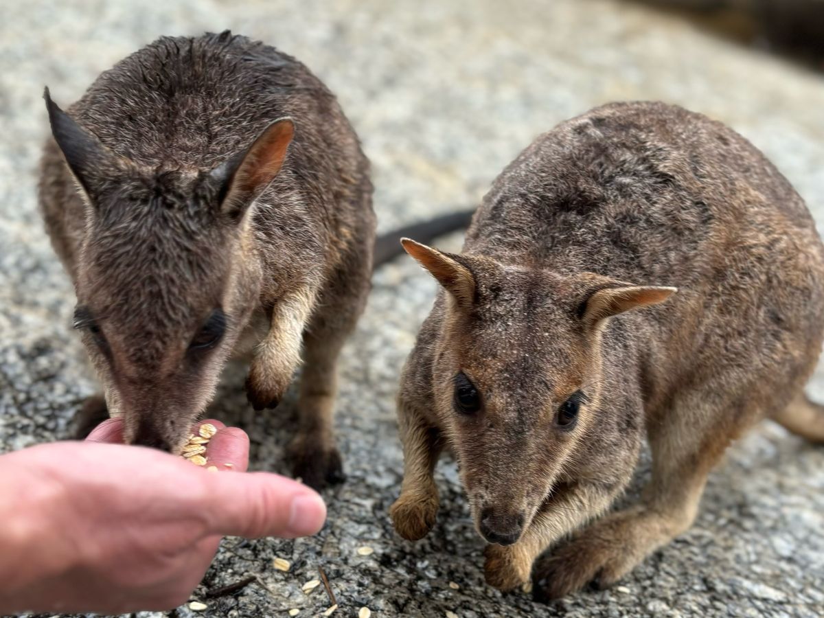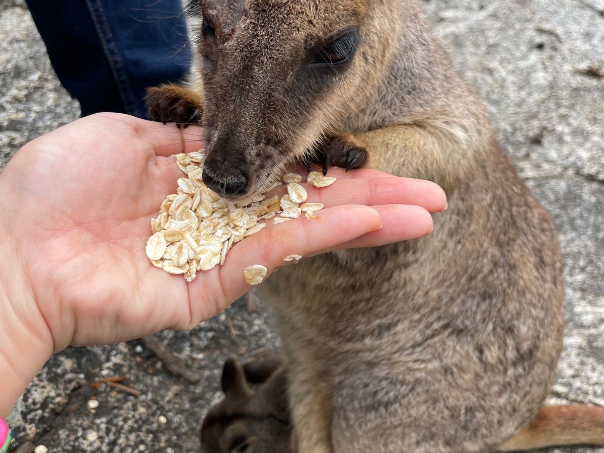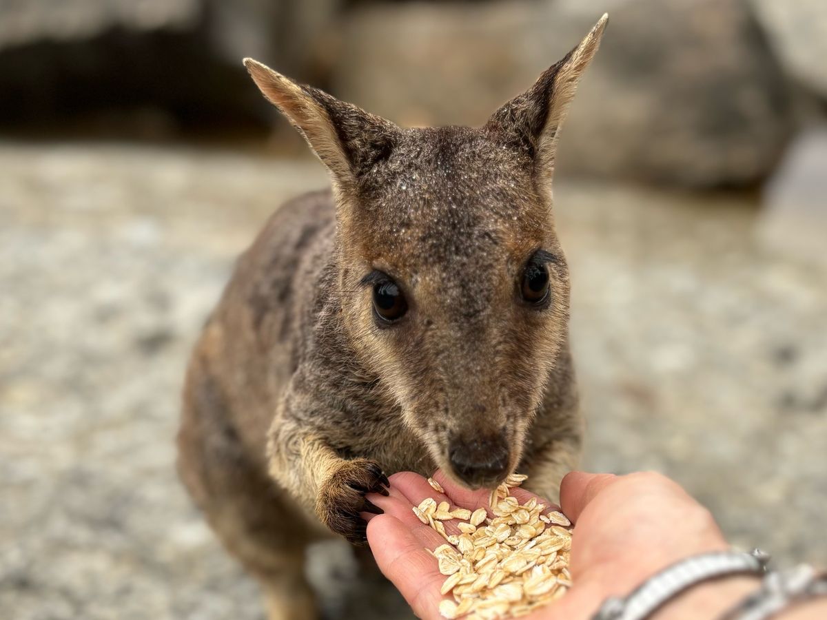 ナッツを食べた後はグラナイト渓谷に移動です。赤ちゃんよりちっちゃな手で手を掴まれ(感動的!)、手から餌を食べるロックワラビーがすごくかわいいです。餌はシェーンさんが手においてくれます。