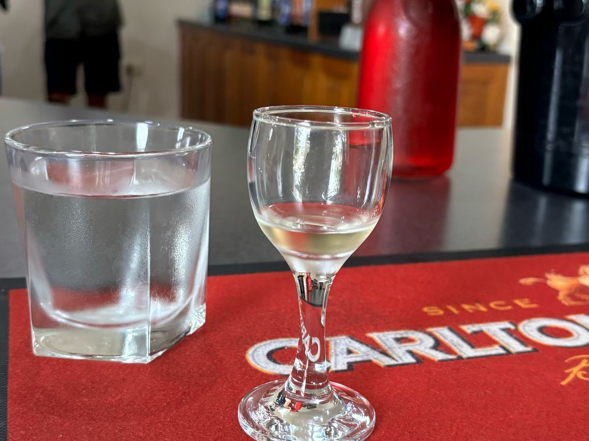 ワラビーと触れ合った後は、ワインのテイスティングへバスで移動です。シェーンさんが注いでくれます。リキュールなので甘くておいしいです。