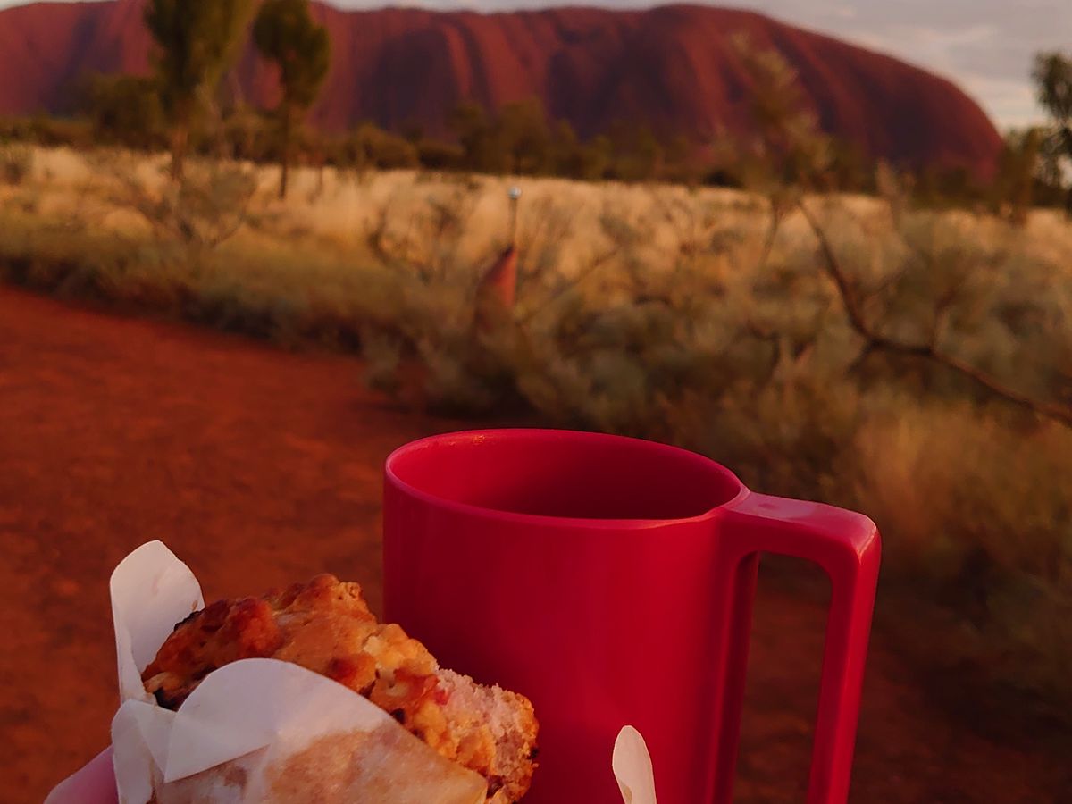 まずはウルルのサンライズを鑑賞し、マフィンや温かいコーヒーをいただきました。この時期は日の出前は寒いので重ね着をお勧めします。