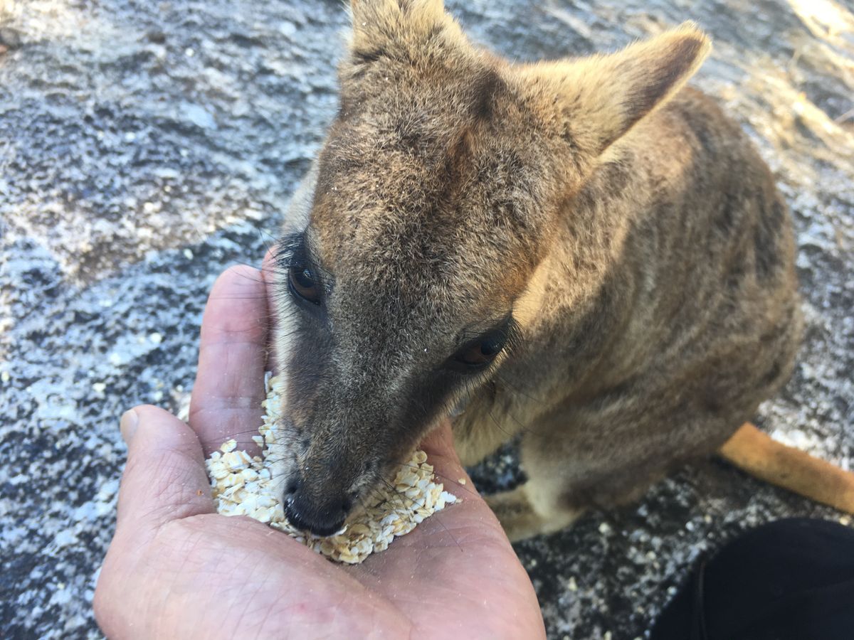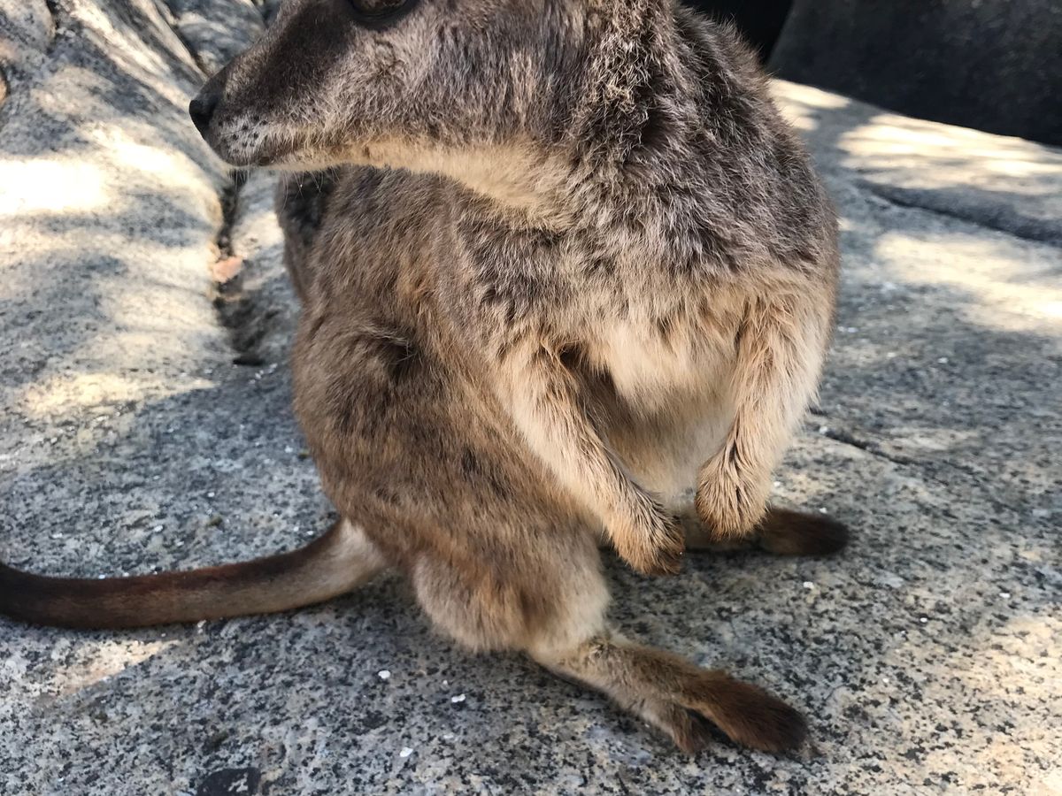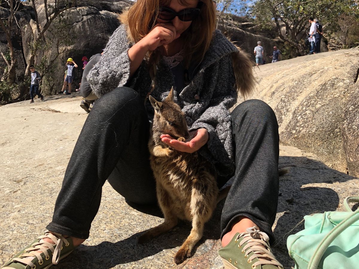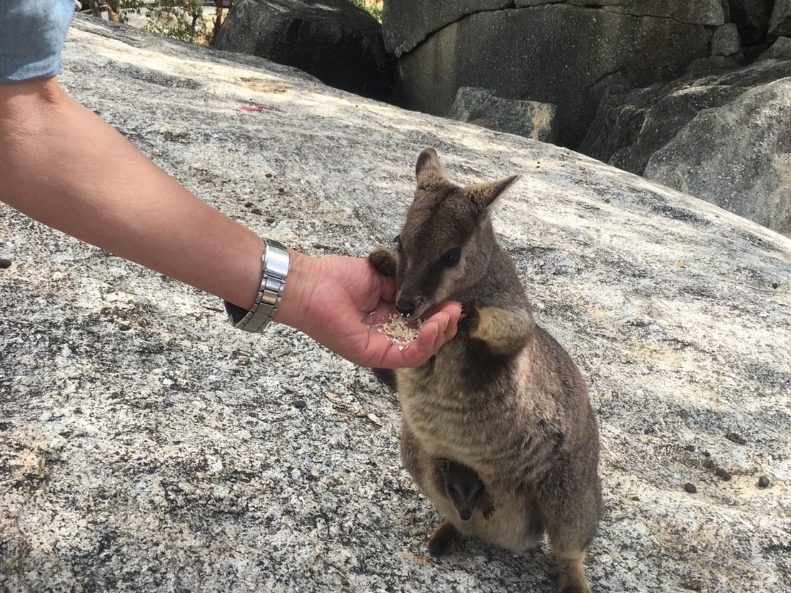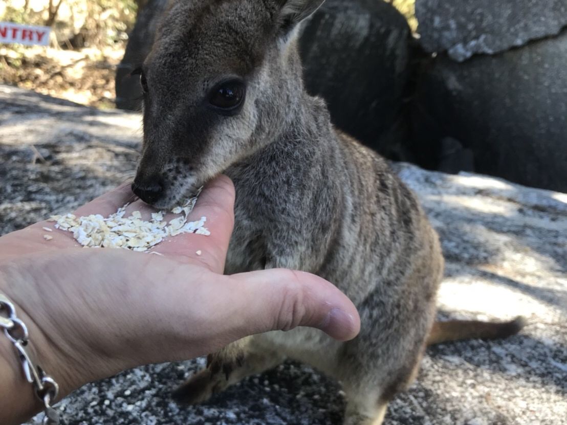 そして一番写真をたくさん撮った場所はグラナイト渓谷です!野生のロックワラビーとたくさん触れ合うことができました!自分の手から餌を食べてくれてとっても可愛かったのですが、お腹が空いていたのか3匹同時に餌へと群がってくることもあり…少々手が痛かったです(笑)赤ちゃんのワラビーも見ることができました!