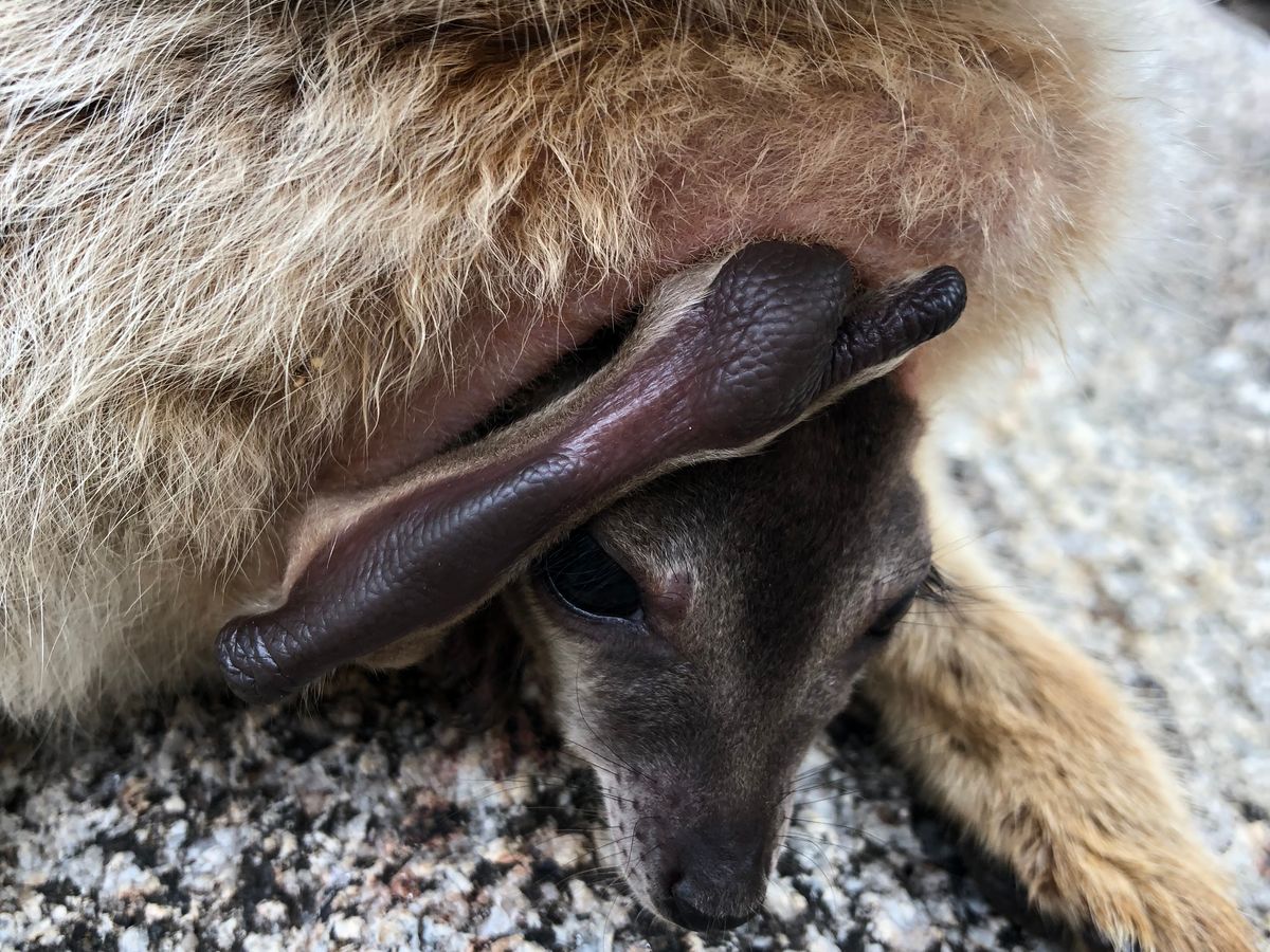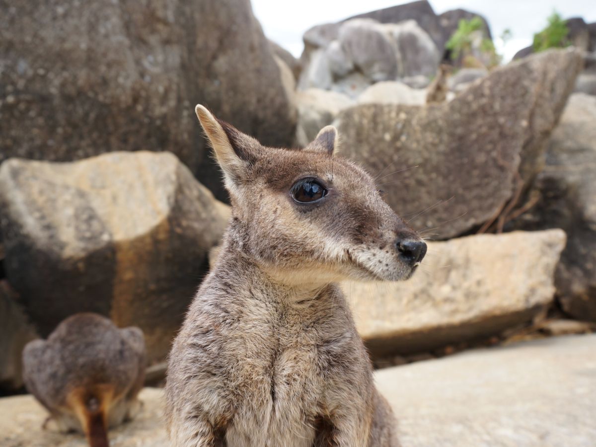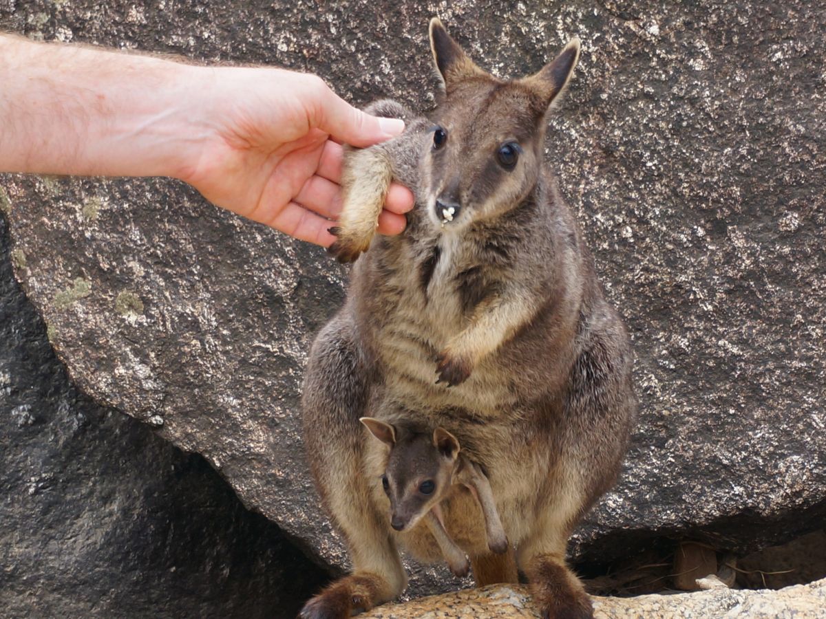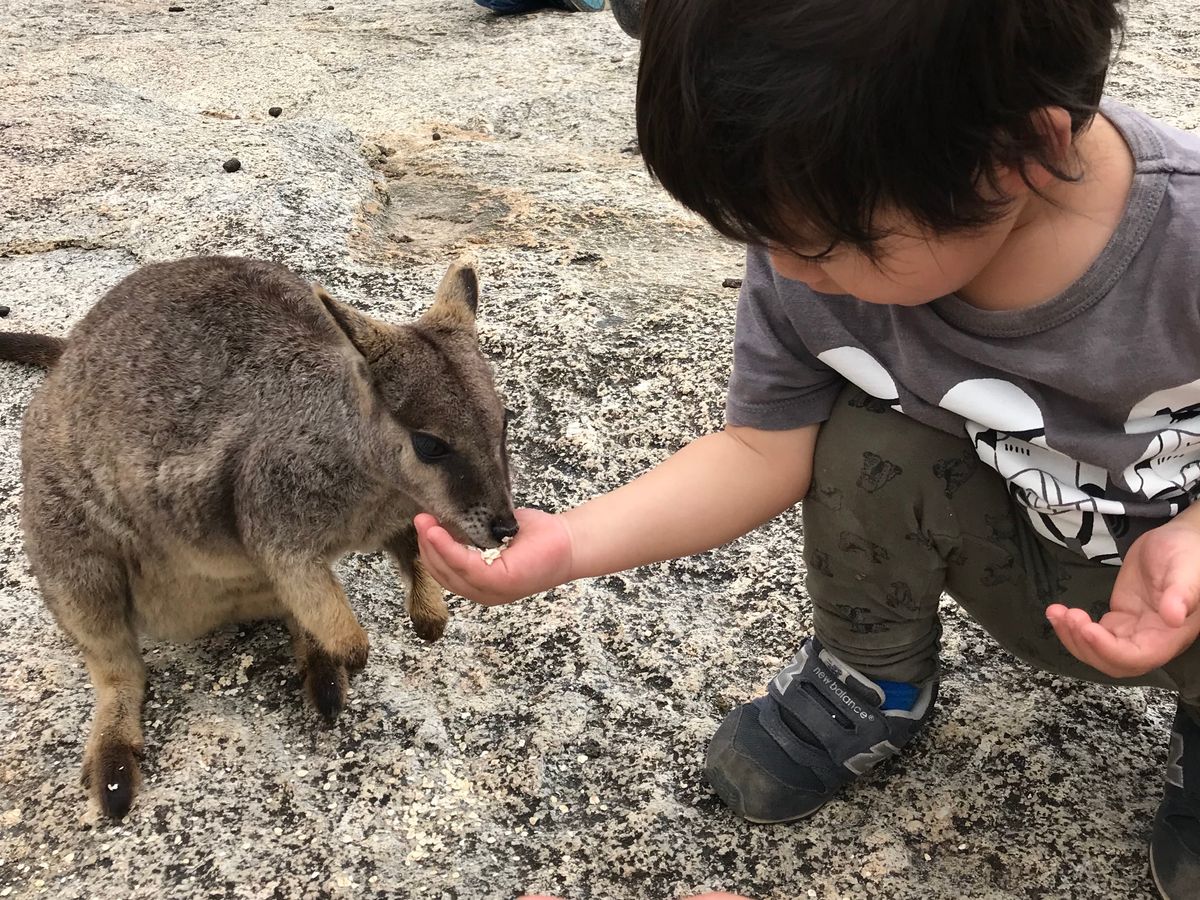 そして一番写真をたくさん撮った場所はグラナイト渓谷です!野生のロックワラビーとたくさん触れ合うことができました!自分の手から餌を食べてくれてとっても可愛かったのですが、お腹が空いていたのか3匹同時に餌へと群がってくることもあり…少々手が痛かったです(笑)赤ちゃんのワラビーも見ることができました!