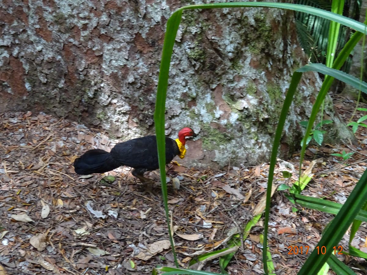 いつもは動物園の箱の中でしか見たことが無い生き物が堂々と生きている姿に感動しました。すると横から落ち葉を踏みしめる音が・・・見るとブッシュターキーが!人を恐れることなく歩いていました。鮮やかな赤と黄色と縦長尾。感動の嵐です。