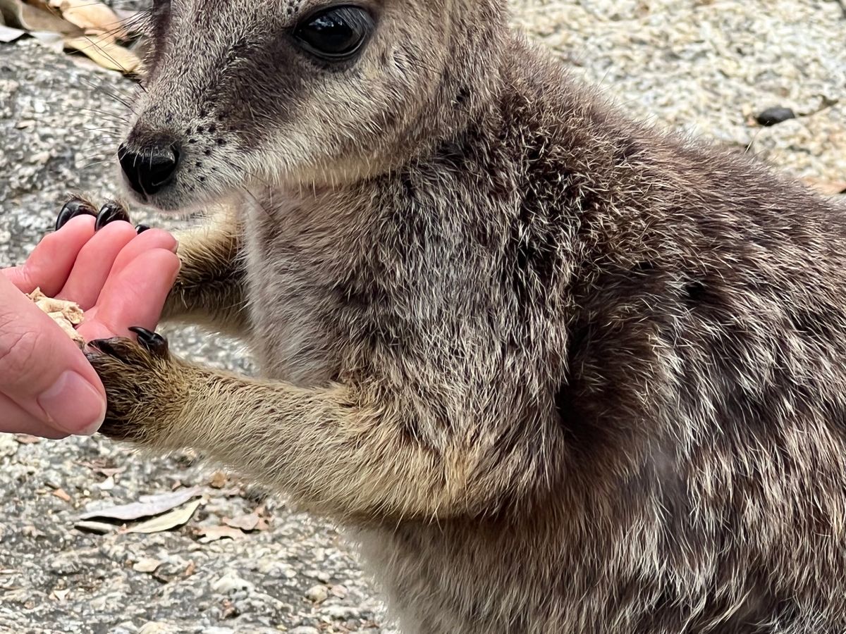 渓谷ではシェーンさんの呼び声でどこからともなくロックワラビーがやってきて餌をあげることができました。お腹に赤ちゃんが入っているワラビーもいてとても可愛かったです。他にも蛇やトカゲと戯れることもできました。