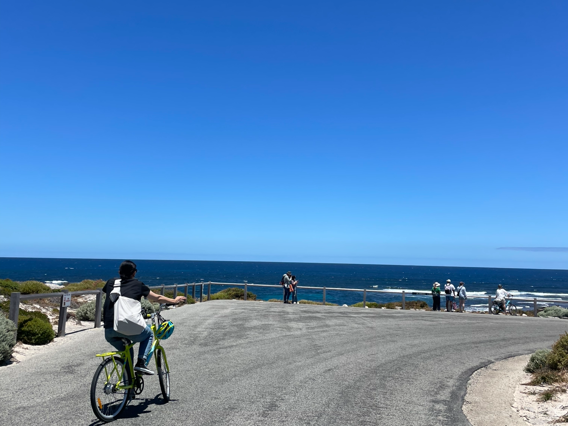 当日は風が強く海が荒れて少し船酔いをしましたが、レンタサイクルと共に無事ロットネスト島に上陸。一路西の先端まで自転車を漕ぎました。どこまでも続く青い空とターコイズブルーの海が本当に綺麗でした。風がもう少し弱ければ、サイクリングも楽に出来たと思います。