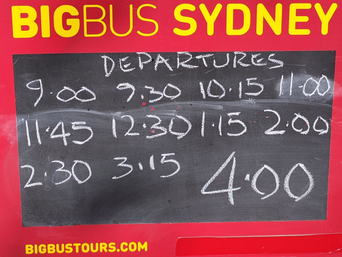 ボンダイ・ビーチのコースは、2時間に1本のみ。市内コースも45分間隔(写真参照)で、気楽にHop On/Off出来ない運行スケジュールでした。特に、ボンダイ・ビーチのコースと市内コースの間で乗換えるには運行状況を把握しておくことが必須です。