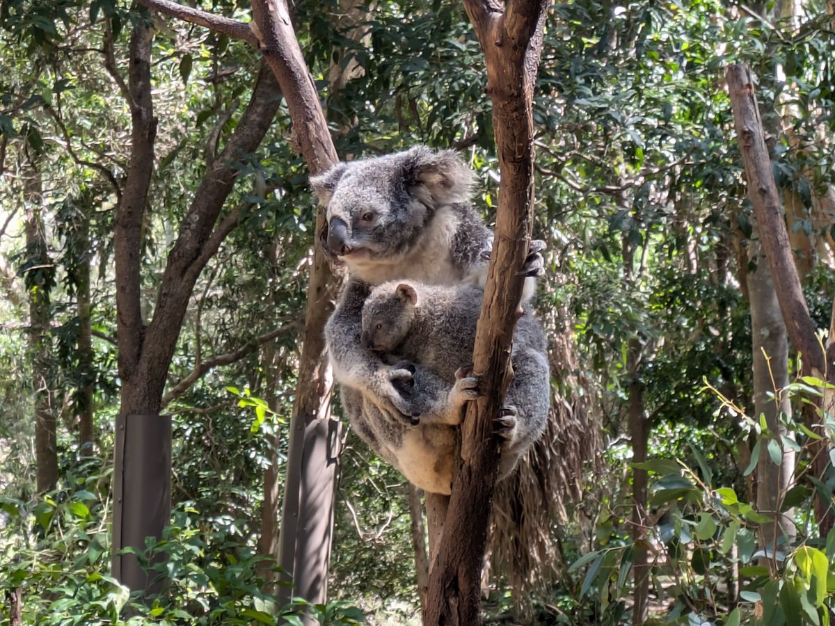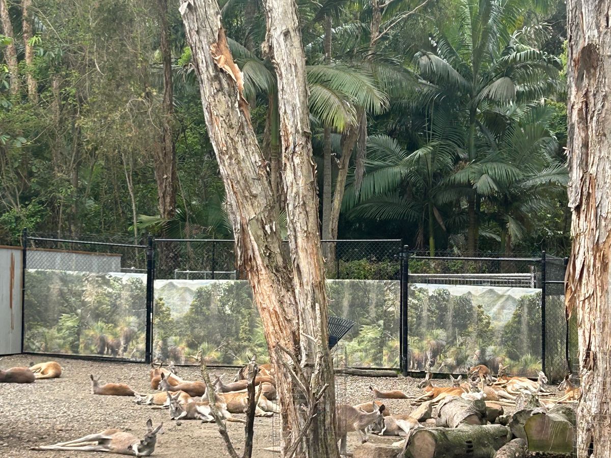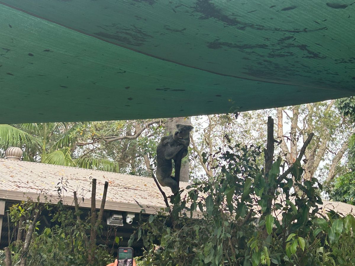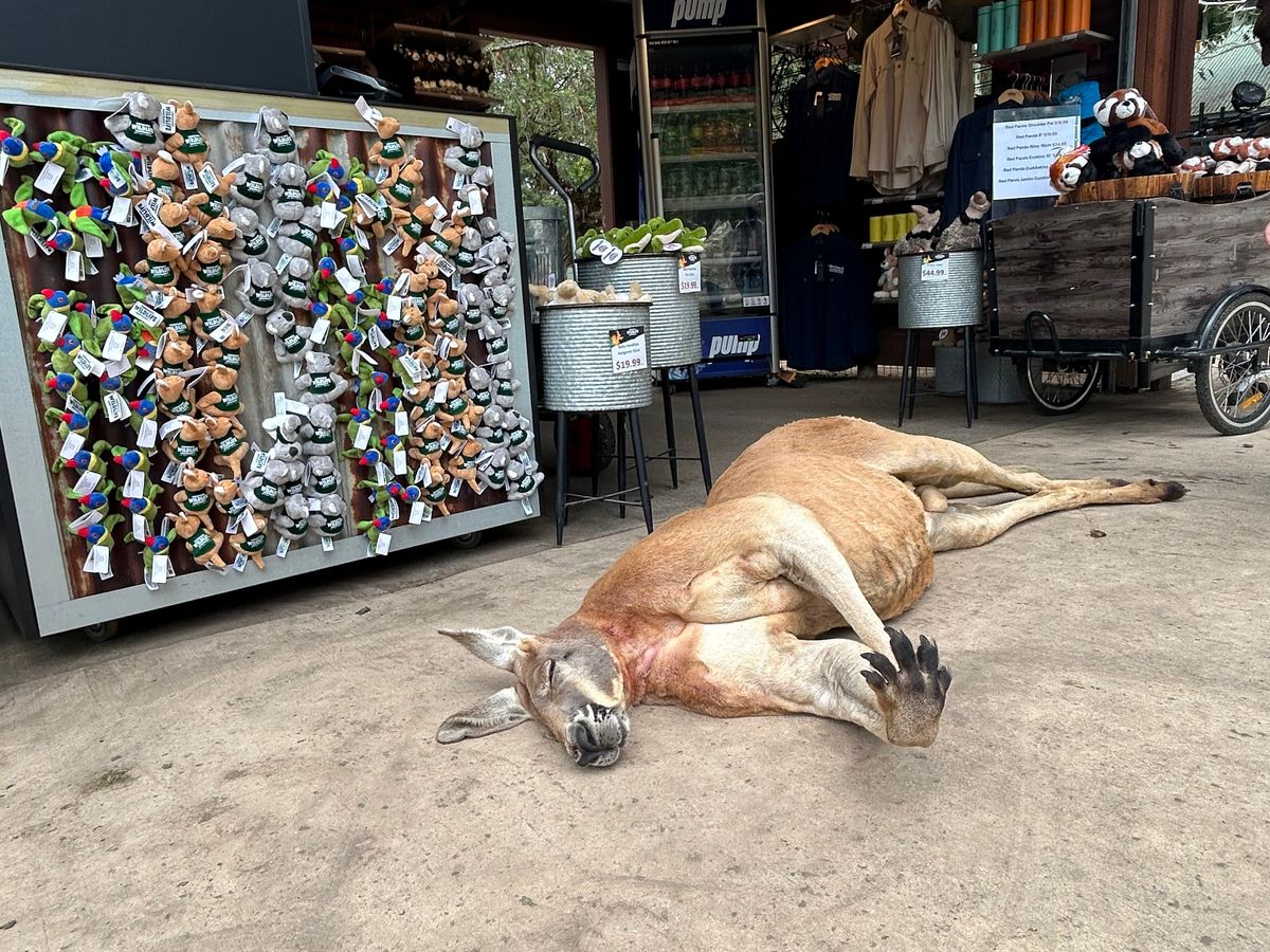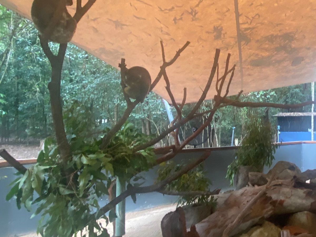10時過ぎぐらいに到着しましたが、入場には長い列が…事前購入だとスムーズに入れます!入ってすぐにコアラがお出迎え♪コアラ抱っこ写真の受付も入り口すぐにあるので、迷わず行けるかと思います。コアラ抱っこはコアラ保護のため少しずつ制限がでてきているようで、事前の予約がおすすめだそう…!木に止まっているコアラ達を見るだけでもとっても可愛かったです。次に、カンガルーがたくさんいるエリアに行きました。なんと1匹のカンガルーはお土産屋さんの前に寝そべっていて、びっくり!笑 日本の動物園ではなかなか見られない光景でした。