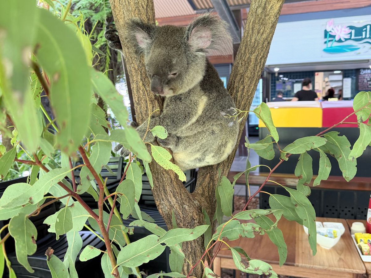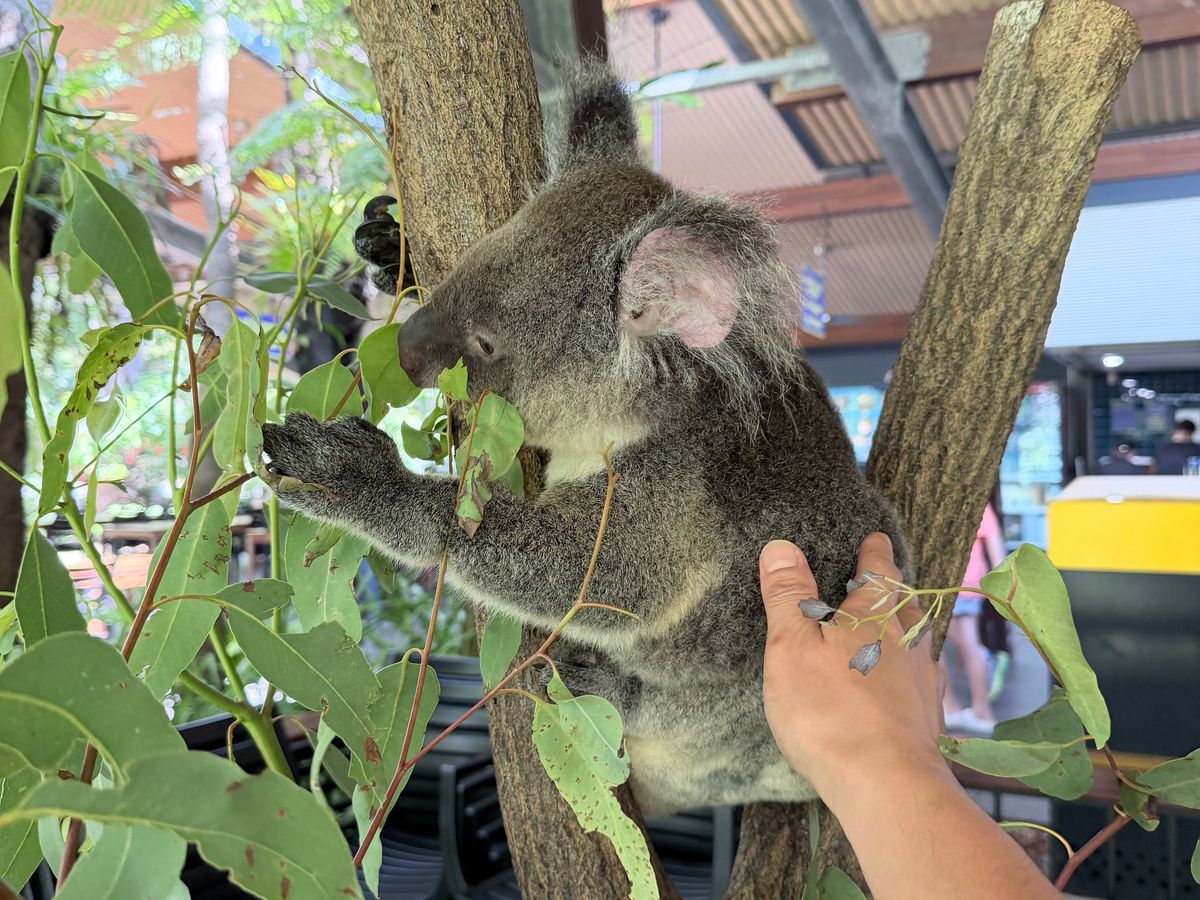 朝食を楽しみながら、すぐ近くでコアラを見ることができます。触れることもでき、約20分ほどはテーブルの横にいてくれました。一緒に写真を撮ることもできましたが、抱っこはできませんでした。