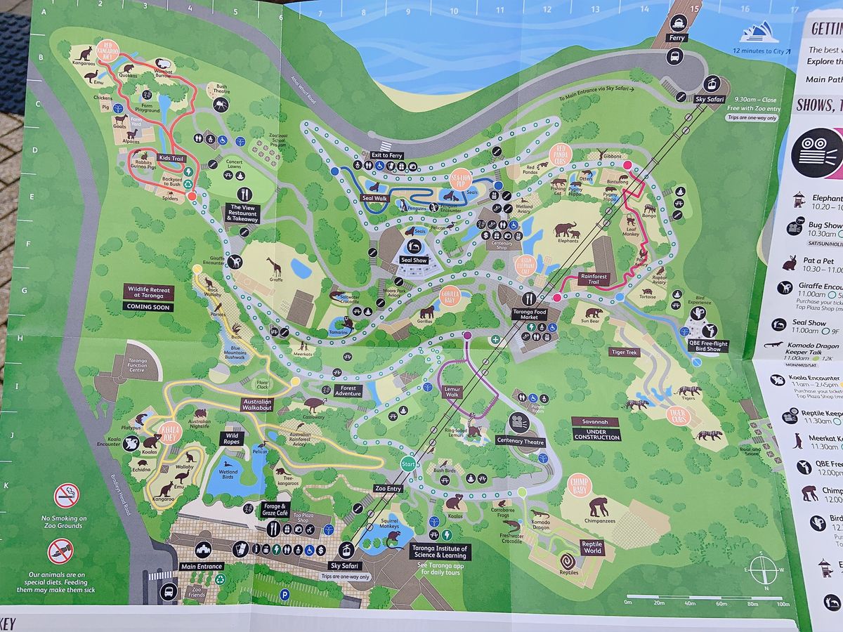 フェリーで、サーキュラシー港から船でタロンガ動物園に。船上から見るオペラハウスと陸地から見るオペラハウスは、顔が違ってよかったです。船で15分くらいで目的地に着きました。そこから入口へはスカイリフト(ゴンドラ)に乗って山を登るようでした。リフトから見る対岸の景色もきれいでした。入ってまずは何を見るか計画を立てました。鳥のショー(12時から)、アザラシのショー(2時から)をメインに園内を回りました。(無計画で行くと、歩き回っているだけで時間がたってしまいそうです。)