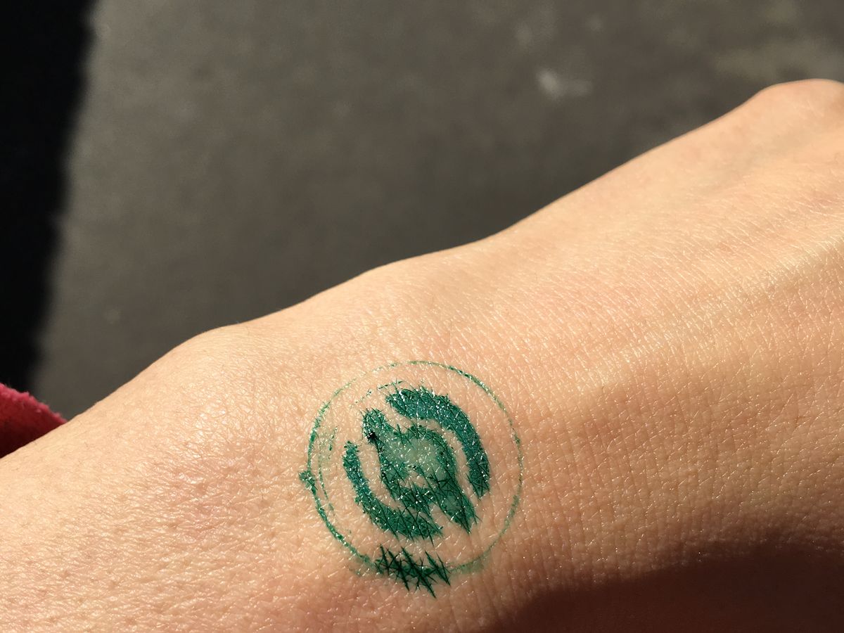 入園時、手に緑色のスタンプが押され、再入園時にこのスタンプをスタッフに見せる。ただ、インクが滲みやすく、服についたり、手洗いの時に落ち易いので注意が必要。