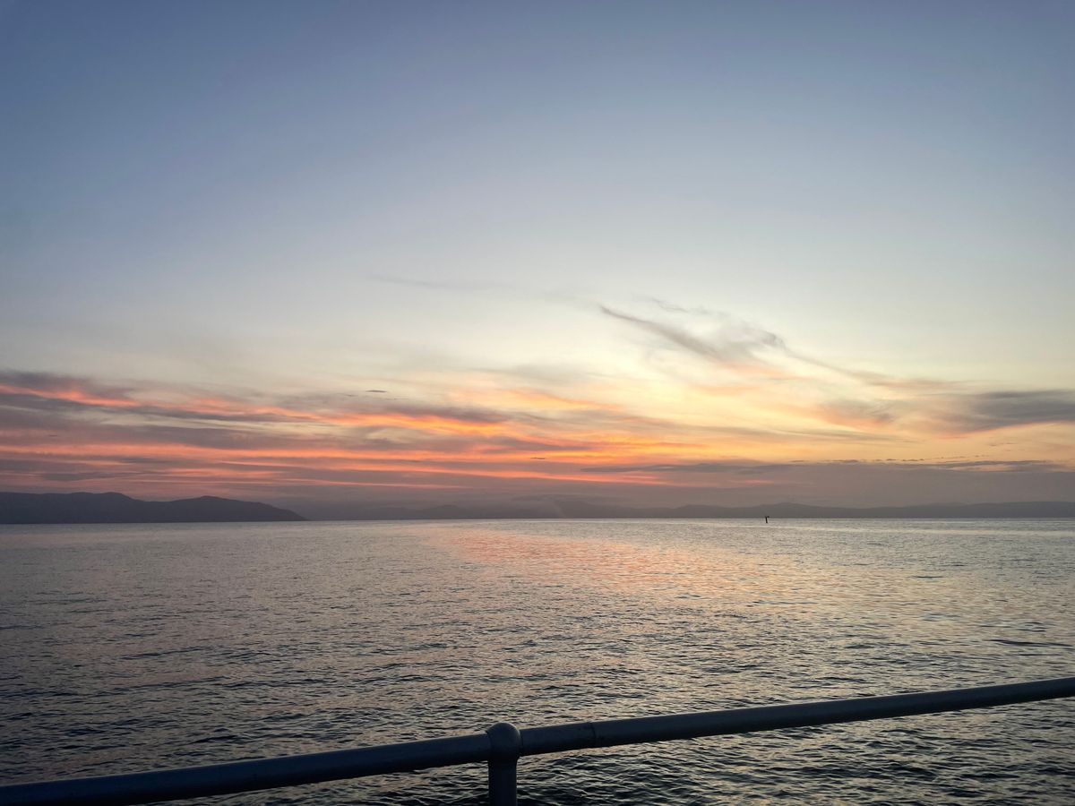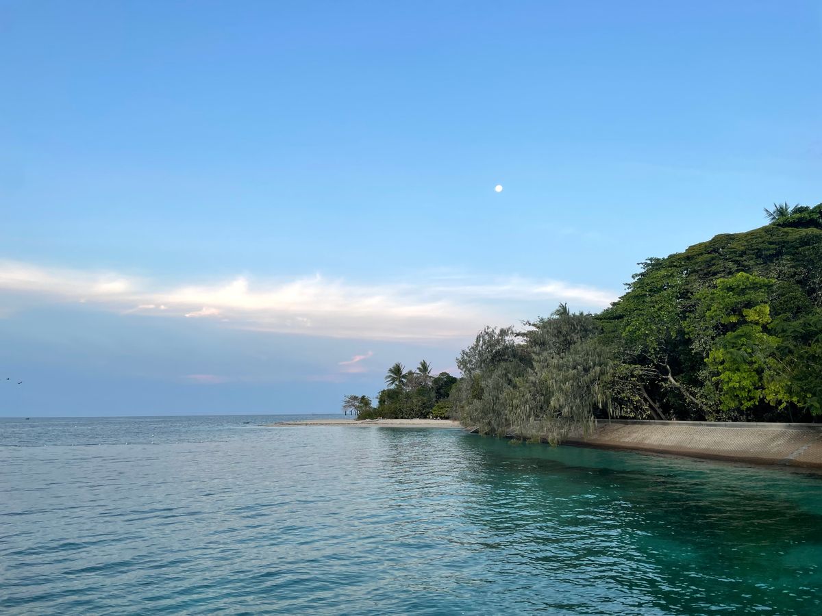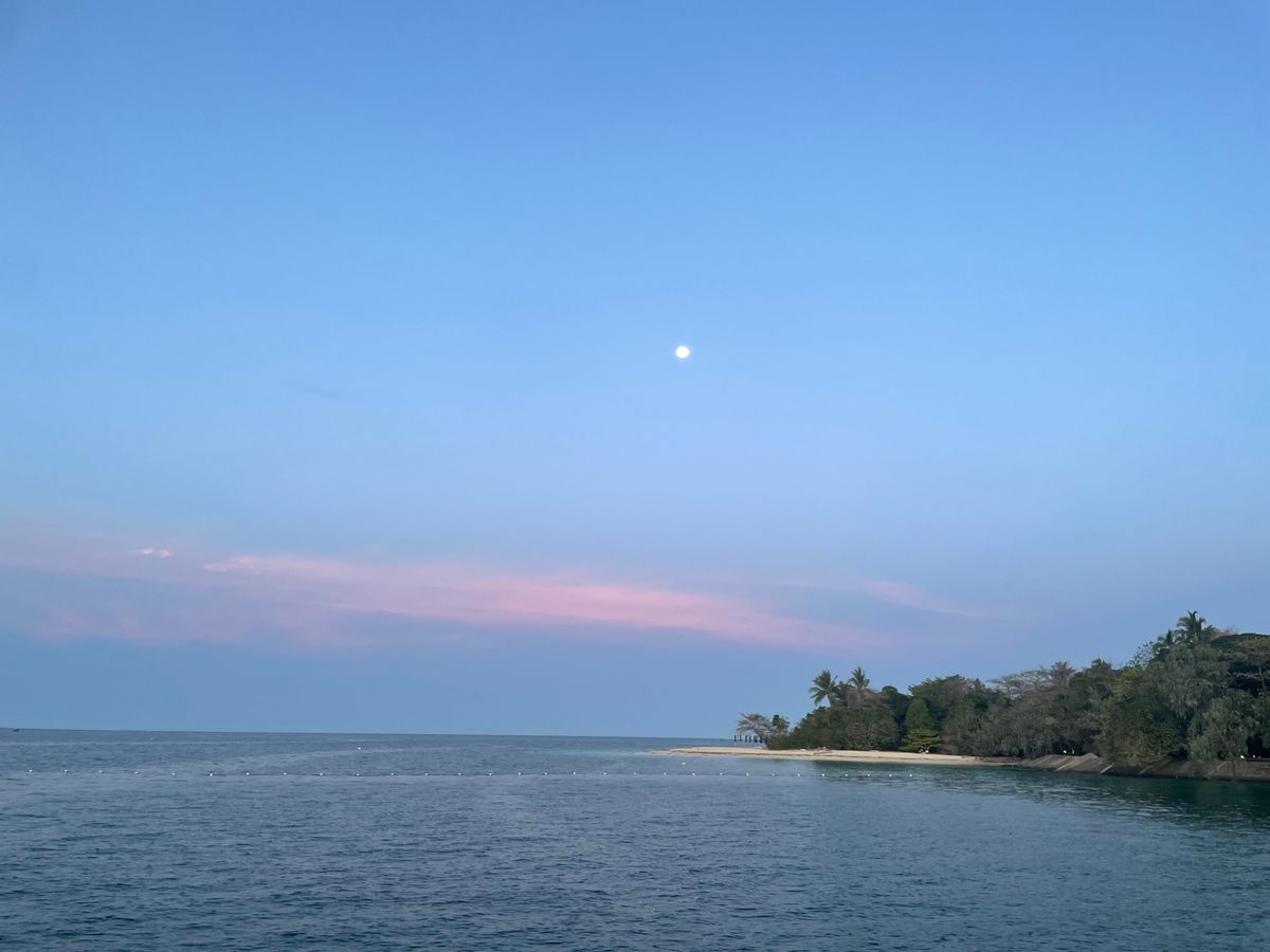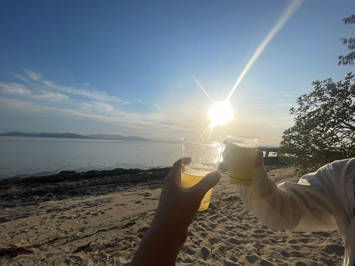 17時にサンセットドリンクで酒又はジュース1杯を飲むことができ、夕日を見ながら飲むシャンパンは最高でした。夕陽が沈むまでに島を1周しましたが、砂浜を歩いて歩きにくかったため、30分くらいかかりました😂