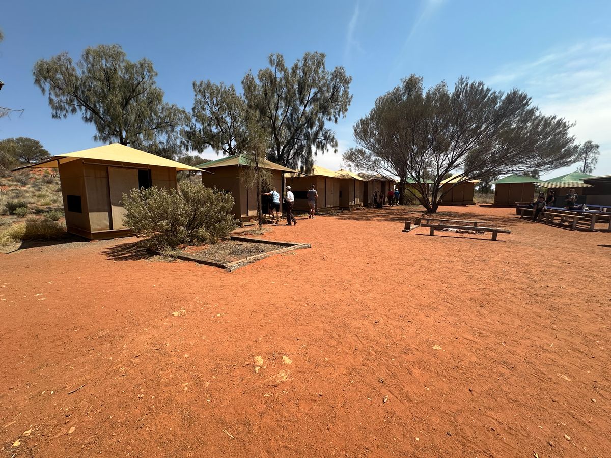 お迎えのガイドさんに連れられて、到着したキャンプ地にはすでにたくさんのツアーの方がいました。着くなり、ランチの準備をみんなが始めたので、状況が掴めず戸惑いました。徐々にわかってきたのは、他のツアーの方々はアリススプリングスから出発していること、そのツアーの中に途中参加、途中離脱の形で参加させてもらっているということでした。初日のランチはついていないとツアー内容にあったので、食べてから行ったのですが、私たちの分もあったようで申し訳なくなりました。英語力があまりないこともあり、ほかの方々とうまく馴染めず、かなり居心地が悪かったです。カタジュタ観光の後、キャンプ場に戻ると、ガイドの方が部屋のことを説明されましたが、内容が掴みきれず動かないでいると、ほかの方々が次々と部屋に入っていき、入る部屋がなくなりました。鍵を持っている方が、選んだ部屋を開けてくれると話しかけてきてくれたので、とりあえず近くの部屋を開けてもらいましたが、あまり良くなかったようで、ライトは暗く、ほかの方々よりも条件が悪かったです。遅れて、キッチンに行くと、もうみんなが枕やシーツをもらっていて、ここでも出遅れてしまい、結局タオルをもらうことができませんでした。色んな人と話したいと思い、ツアーに参加しましたが初日はほぼ話せず、ツアー参加を後悔しました。2日目、サンライズ散策などを経て、戻ってきたキャンプ場でのランチの時にやっと自分からどう動いていいかが掴め、協力して動くことで、皆さんも話しかけてくれるようになり、打ち解けてきましたが、そこで終了でした。ツアー客全員が同じスタートなら、また違ったかと思いますが、途中参加の形なので、英語力、コミュ力のある方じゃないと厳しいと思います。また、ツアー内容はガイドの方にもよりけりなのか、ムティジュル泉には行っていません。あと、満点の星空ではありませんでした。outbackホテルの展望台の方がよっぽど綺麗に星が見えると思いました。キャンプ場は思ったほど、エアーズロックに近くはないので、ホテルからの音楽が聞こえたりして、あまり大自然という感じではなかったです。カタジュタ、サンセット、サンライズのツアーにまとめて参加できたのはよかったと思います。12:00くらいにツアーが終わるとのことでしたが、12:20くらいに遅れてホテルに着きました。ホテルに預かってもらっている荷物を出してもらっていると、メルボルン行きの飛行機に合わせたバスが12:20発で出発してしまい間に合いませんでした。頻繁に空港行きのバスがあると思っていたので、他にもうバスがないということがわかった時にはとても焦りましたが、ホテルの方が見るに見かねて、車を出してくれました(有料)何事においても、しっかりと確認することが大事だ思いました。