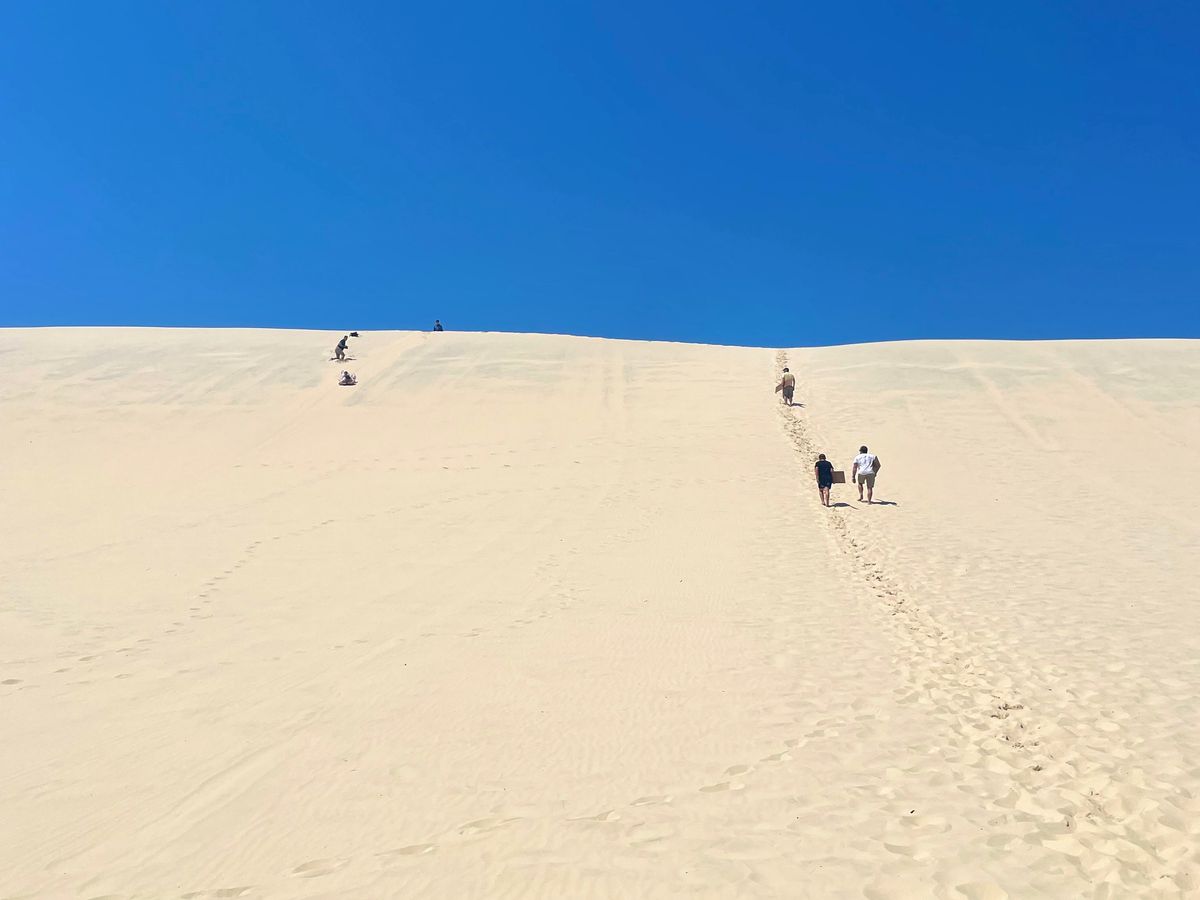 砂丘でのサンドボードは、初めての体験で最初は少し怖いなと思っていましたが、滑ってみたらとても楽しく、合計3,4回ほど滑りました。滑り降りるために砂丘を登るので足は疲れました。また、砂丘までバスで約10分程移動するのですが、結構揺れました。私は少し車酔いしました。