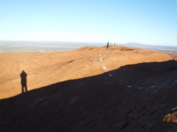 シドニーへ戻る日、再びウルル登山にリトライ。天気予報では風はまずまず。サンライズ渋滞で、国立公園のゲートを通過するのに20分以上かかりましたが、何とか通過。ウルルに近づくと人が上っているのが点々と見えます。意を決して、2時間弱の登山に臨みます。最初の鎖のある急登。20分ほどかけて一歩づつ、息を切らしながら登ります。鎖の終点では、さらに上ってくる人の列が見えます。駐車場ははるか下、遠く地平線が広がります。そこから、鎖の無い急登、10分ほどで頂上部の縁に到着。カタジュタも見えだします。杖をついたおばあさんや5才くらいのこどもも登っていてすごいなと感心。ここからは穴のある頂上部を数mの上り下りを繰り返しながら頂上を目指します。白線で登山道が示されていてわかりやすいです。一枚岩というだけあり岩の道ですが、ほどほどに凸凹がありそれなりにグリップがあります。20分くらいで頂上に到着。360度の水平線と厳かな景色に感激です。