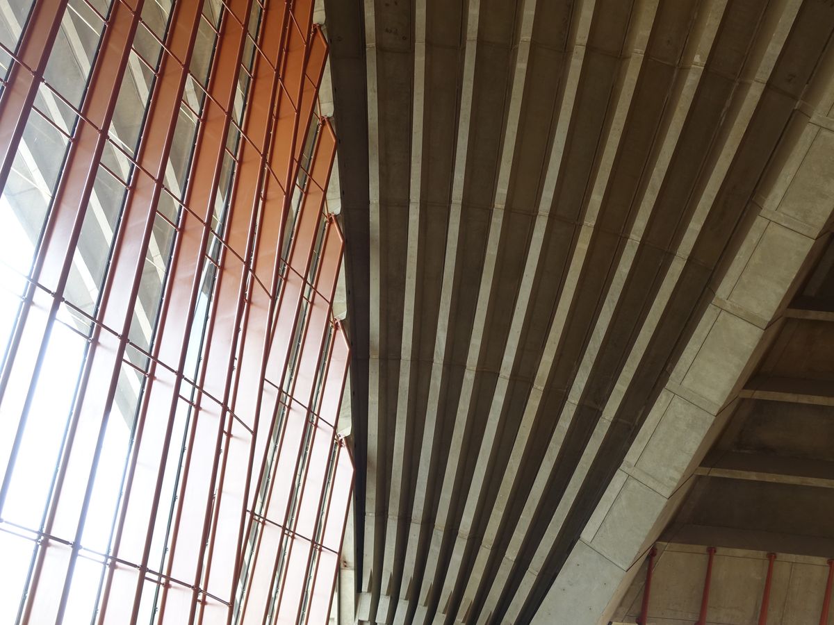 ヨットの帆をイメージした斬新なデザインは、実際に見るまでは、屋根の部分は真っ白な一枚のプレート状だと思っていました。実際は小さなタイルを張り合わせて出来ており、色も純白ではなく、黄色いタイルを途中にちりばめたもので、太陽光の反射などを考慮したものだという説明を聞きました。今のようにコンピューターなどない時代に、どのように計算したのだろう?と、しみじみ関心しました。