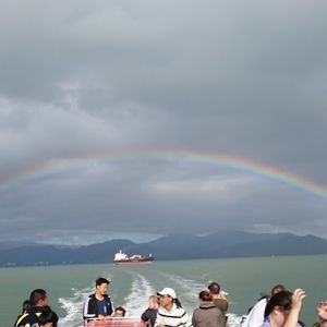 雨が降ったり止んだりでしたが、お陰で行きの船(8:30発)から完全な虹が見れました。