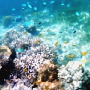 景色は写真のように、水の色が違う。 感激ものです。 バスクリンのお風呂の様な水の色です。 また、魚、カメが写っている写真を載せてますが、決して水族館ではありません(笑)。 グラスボートから撮ったものです。 参考になればして下さい。