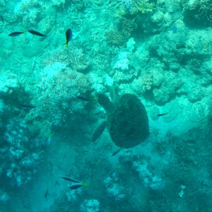 シュノーケルで沖まで泳ぐと、なんとウミガメと一緒に泳ぐことができました。