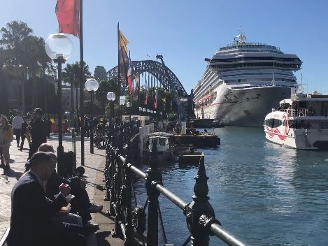 ちょうど停泊していた大型客船が出港するタイミングで、記念写真をパチリ!