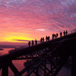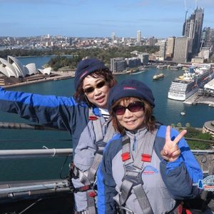 シドニーにクルーズ船が帰着した日、翌日帰国だったためほぼ1日使えるからと、オペラハウス見学と合わせて申し込みました。ホテルに荷物を置いてコンシェルジェにオフィスへの行き方を聞き、スマホでルート検索までしたにも関わらず迷いました。大きな矢印の付いた看板の先は道路を差しているのですが、通り抜けられなかったためです。道路に出てようやくオフィスを見つけました。そこまでで疲れてしまったのですが、「1つ早い回に入れるよ」とのことだったので参加しました。事前準備は念入りで装備チェックや使い方など丁寧に指導してくれます。歩くようにはできていないので歩きにくいですが、一番上まで行くと達成感があります。ちょうど乗って来たクルーズ船がワーフに入っているところを上から見下ろすという珍しい体験もできました。記念写真を1枚くれるもの良いサービスだと思います。