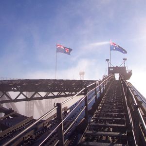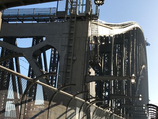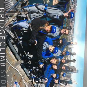 ガイドさんもとても気さくな方で、耳につけたイヤホンで解説してくれます(もちろん英語なのでほぼ聞き取れず・・)。はじめに着替え・練習をし、いよいよ橋へ。意外とハシゴ登りが多いです。しかしその分、登った後にはシドニーの美しい港の景色を堪能できます!3度程、ガイドさんがグループごとに盛り上げながら写真を撮ってくれます。ちなみに動画も撮ってくれるサービスもあり。この写真(動画は写真を買うと付いてくる)は60ドルでUSBで購入可能です。ちなみに1枚でも20ドル程で購入可能。