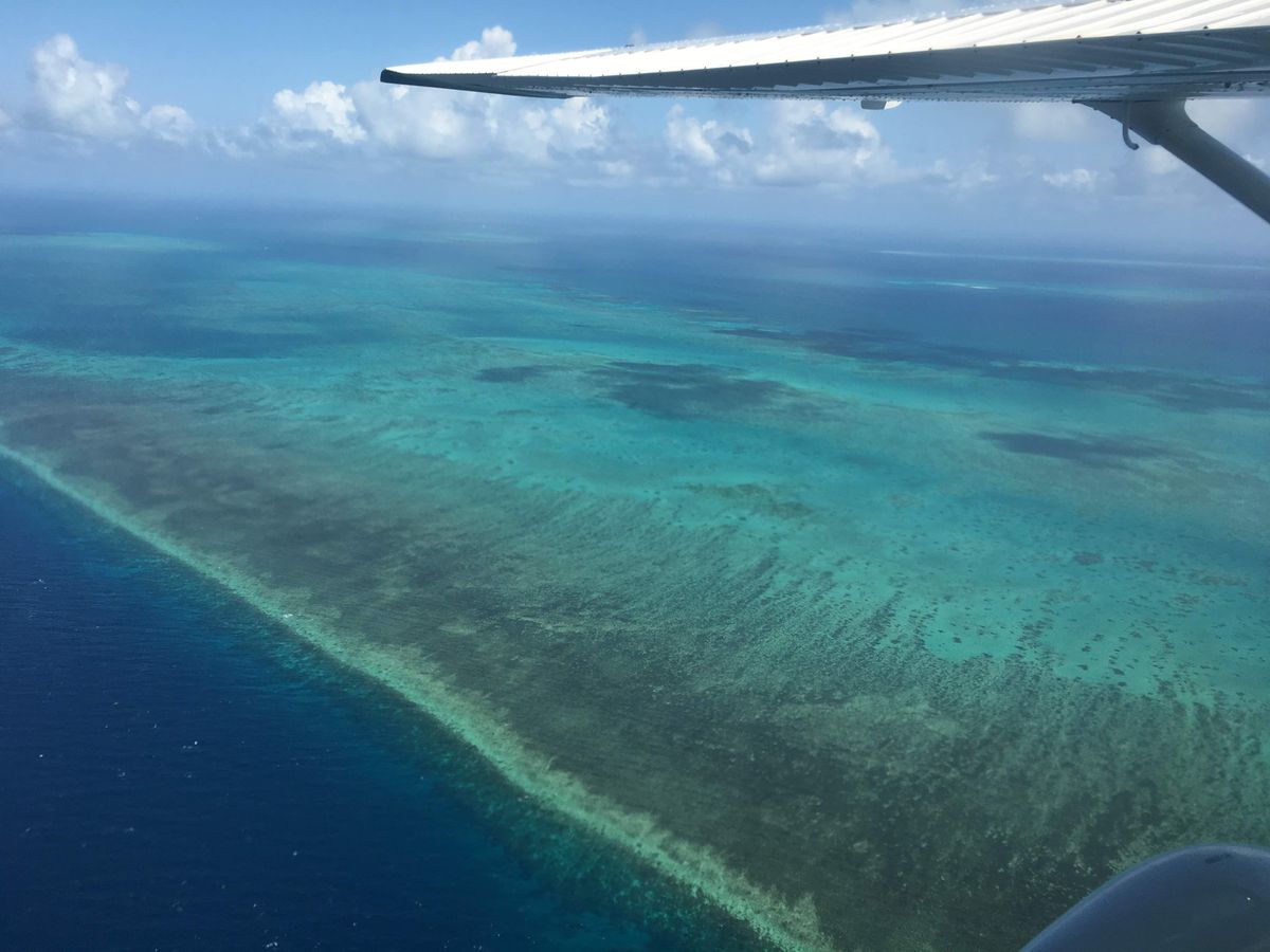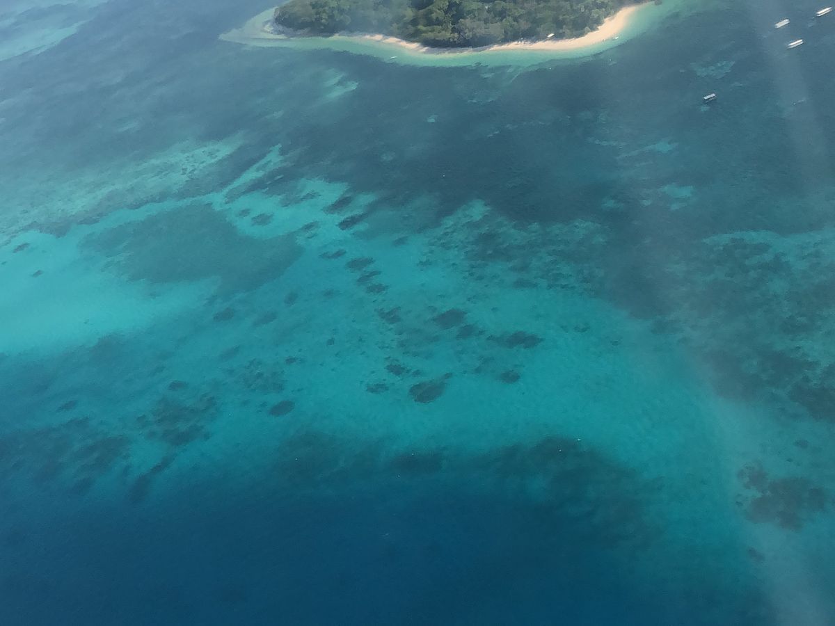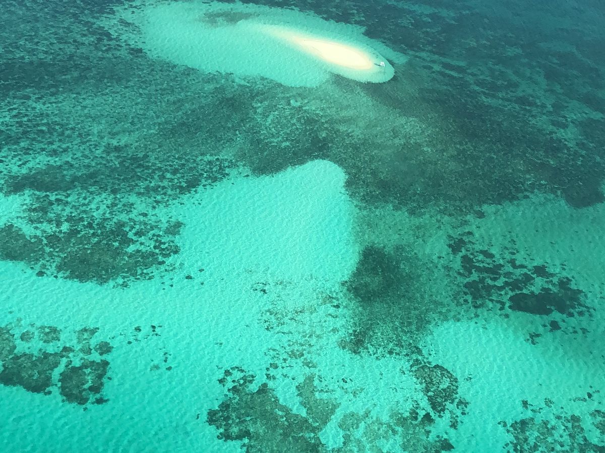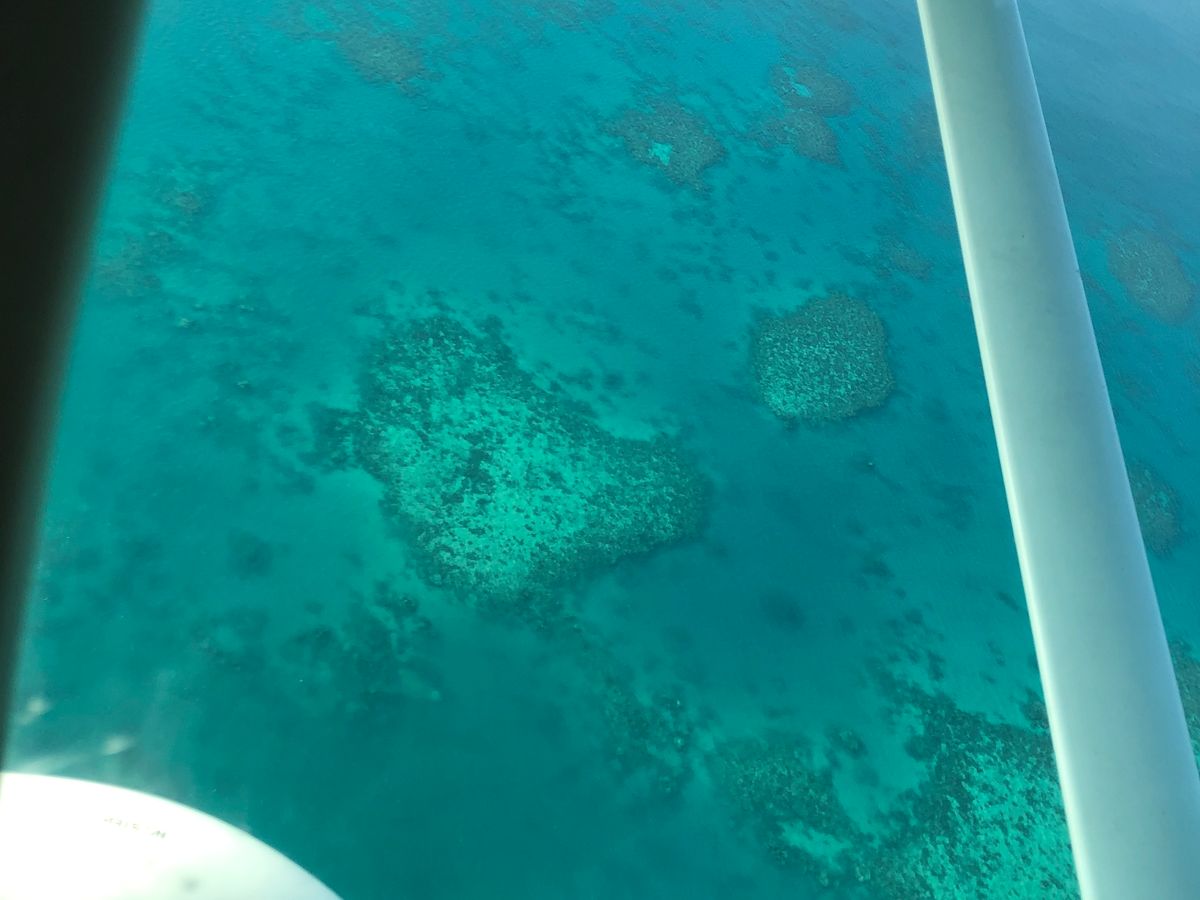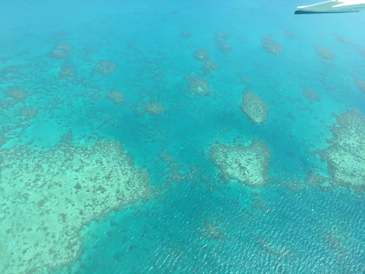 グレートバリアリーフは上空からだといろんな海の色が楽しめます。珊瑚の上はエメラルドグリーンで水が透き通っているので太陽もあいまってキラキラして見えました。