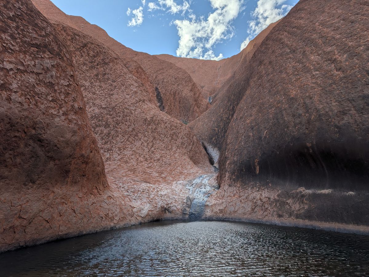 水はバスにタンクで用意してくださっていたので、冷たくておいしい水がすぐ飲めたのは嬉しかったです。ウルルも周りを1週してくださり、先住民に伝わる話や歴史をみっちり学ぶことが出来ました。特に施設で先住民の方が、ライブペインティングをしていたことに驚き、感動しました。サンセットは残念ながら見れませんでしたが、少し晴れた雲の隙間から綺麗な夕焼けの色が見えました!