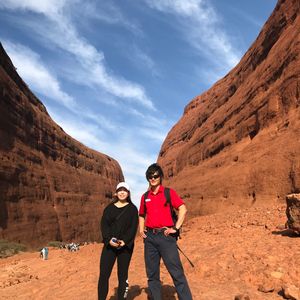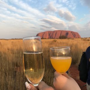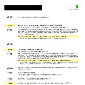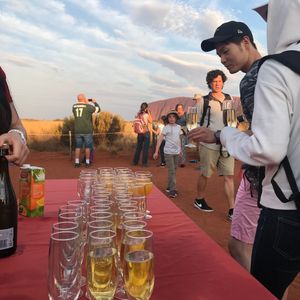 ワーホリの娘を訪ねてシドニーに行きましたが、平日に一人でウルルに二泊旅行し、このツアーを予約しました。空港送迎バスは日本人だけでホッとし、そのままカタジュタ散策に行き、続いてのワイン飲みながらのウルル夕焼けは素敵でした。あいにく小雨がぱらついてと星空観察はできませんでしたが、ツアーの方達とBBQ楽しく酔ってしまいました!ホテルの部屋に着いたのは22時を過ぎてましたが満足!