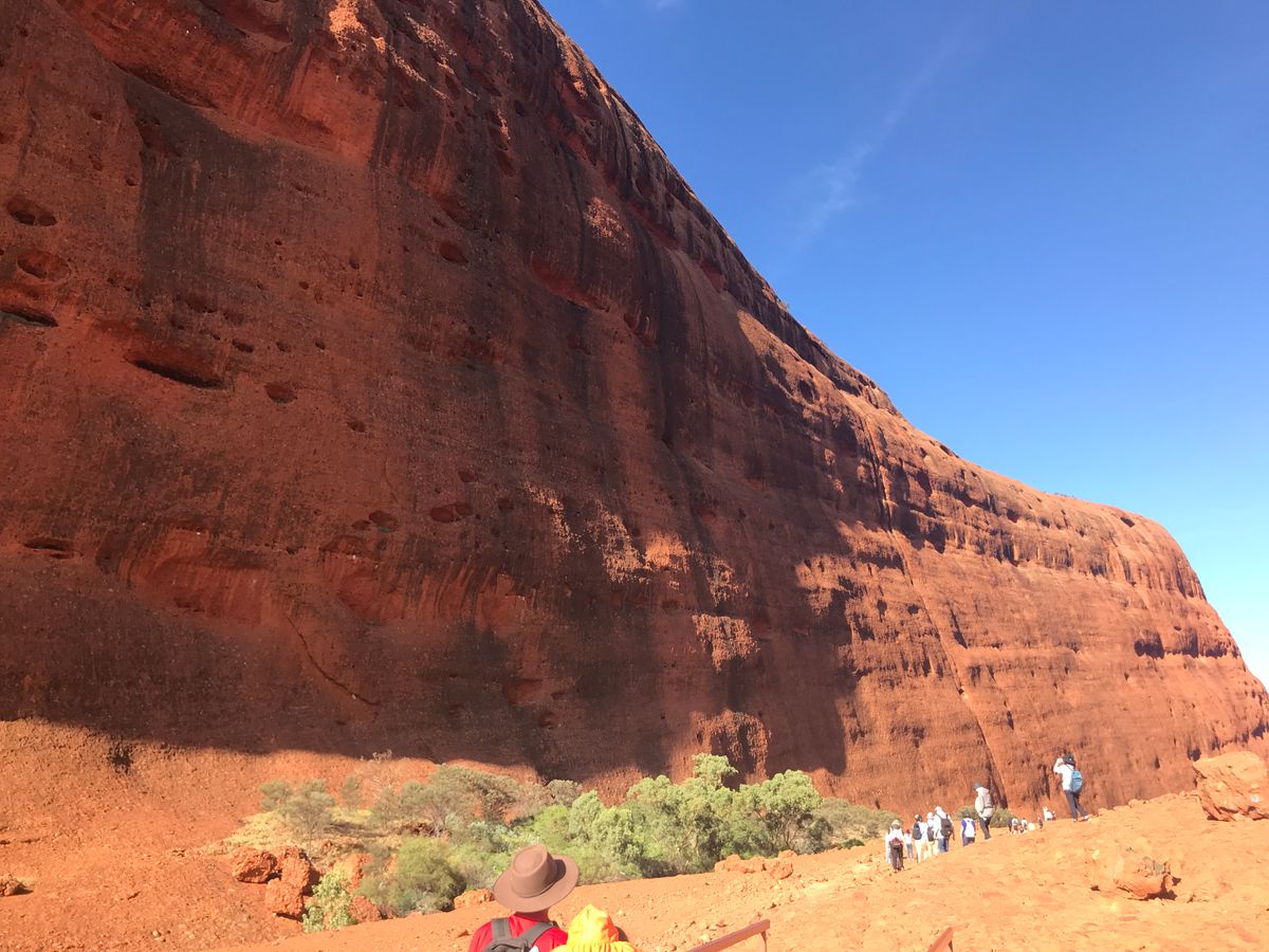 風が強くて、残念ながら最後の機会になるであろう、ウルル登山は出来ませんでしたが、宗教に対する敬意の観点から登らない美徳もあるとのことで、周囲を散歩するだけでもウルルの素晴らしさが伝わってきました。
