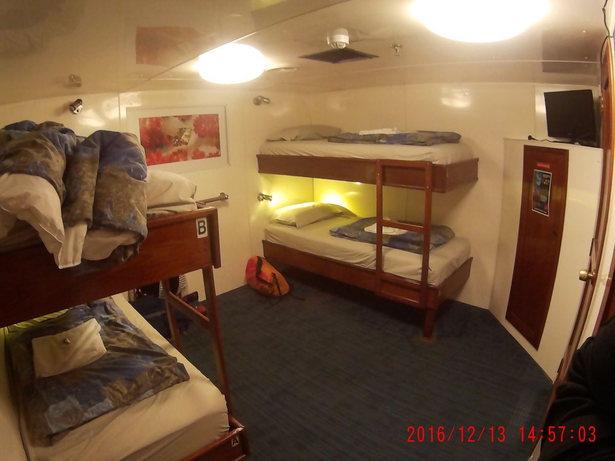 船での生活は、潜って少し休憩して、またすぐに食事があったりと、退屈する時間もなく過ぎていく感じです。シェアルームだったのですが、基本的には男女混合のようなので、気になる方はご注意を。ただし、デッキで休憩したり、ラウンジで話をしたりと、ほとんど部屋内にいる時間もなく、ただ眠るだけだったので、同室の参加者とはほとんど顔をあわせることがなかったです。また、船内の部屋は、湿度の除去やカビの防止のためにエアコンをつけっぱなしにすることになっているらしく、結構寒いです。それもあって私はほとんどデッキで過ごしました。