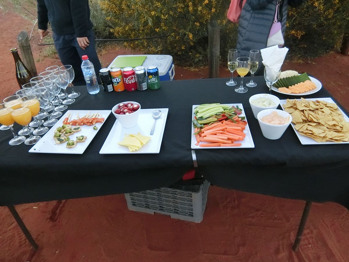 真夏で昼間は気温35度〜40度という季節でしたが、乾燥して,空気が澄んでいたため本当にキレイなウルルが見られました。ガイドの方たちも写真を撮るくらいのいい状態だったようです。用意していただいたスパークリングワインも美味しくたっぷりいただきました。おつまみもとても美味しく、特に野菜やカナッペは秀逸。時間にも余裕があり、案内もシステムがしっかりしていて安心できる対応でした。全体的に初めての方にはオススメできます。