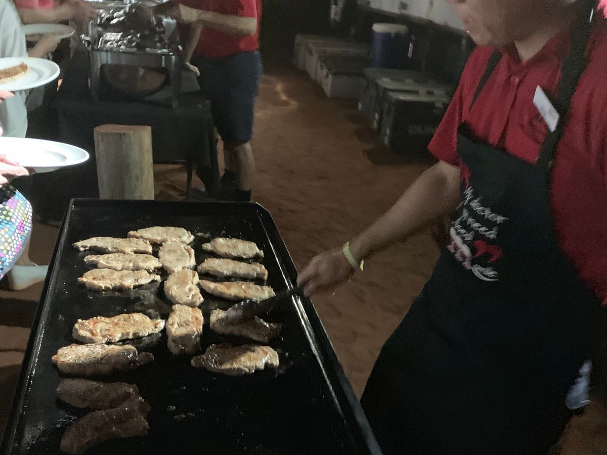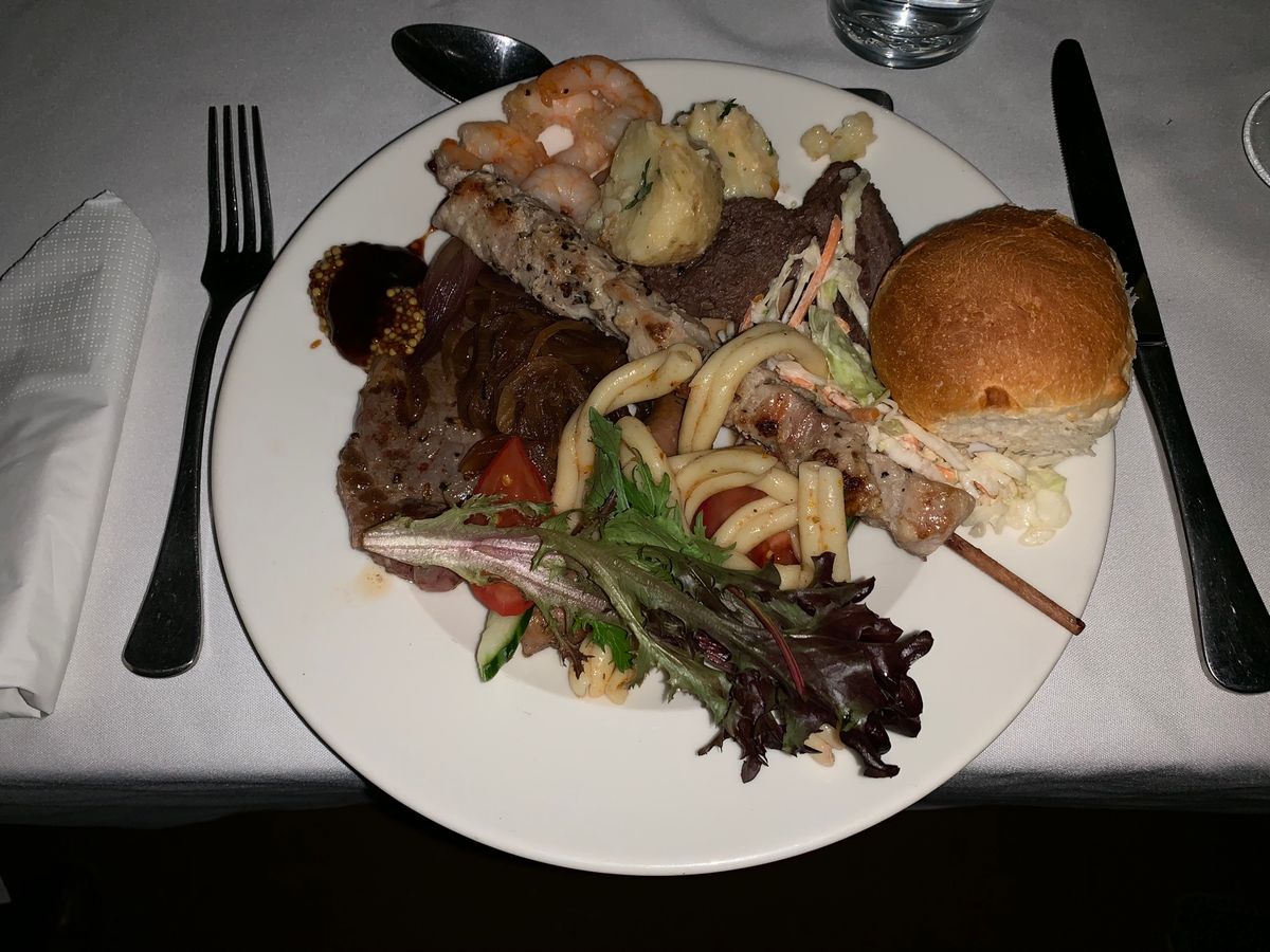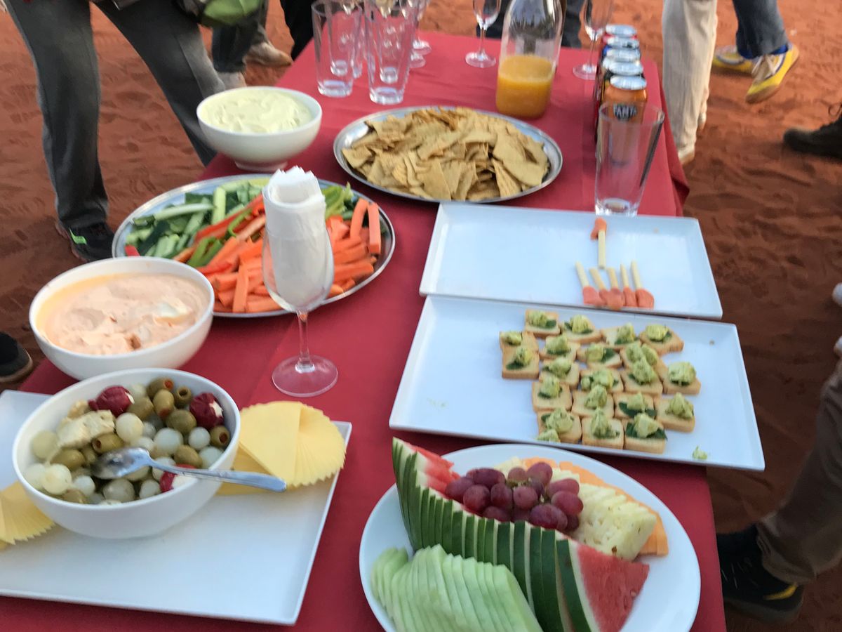 途中で今日泊まるテントに案内された後メインテントに集まり、食前酒を飲みながら他の参加者と会話を楽しみ、その後はまたツアーに戻りながら夕食をとるレストランへ。メニューは野菜、焼き鳥、牛ステーキ、パン、飲み物でした。大人の男性には少し物足りないかな…といった量です。