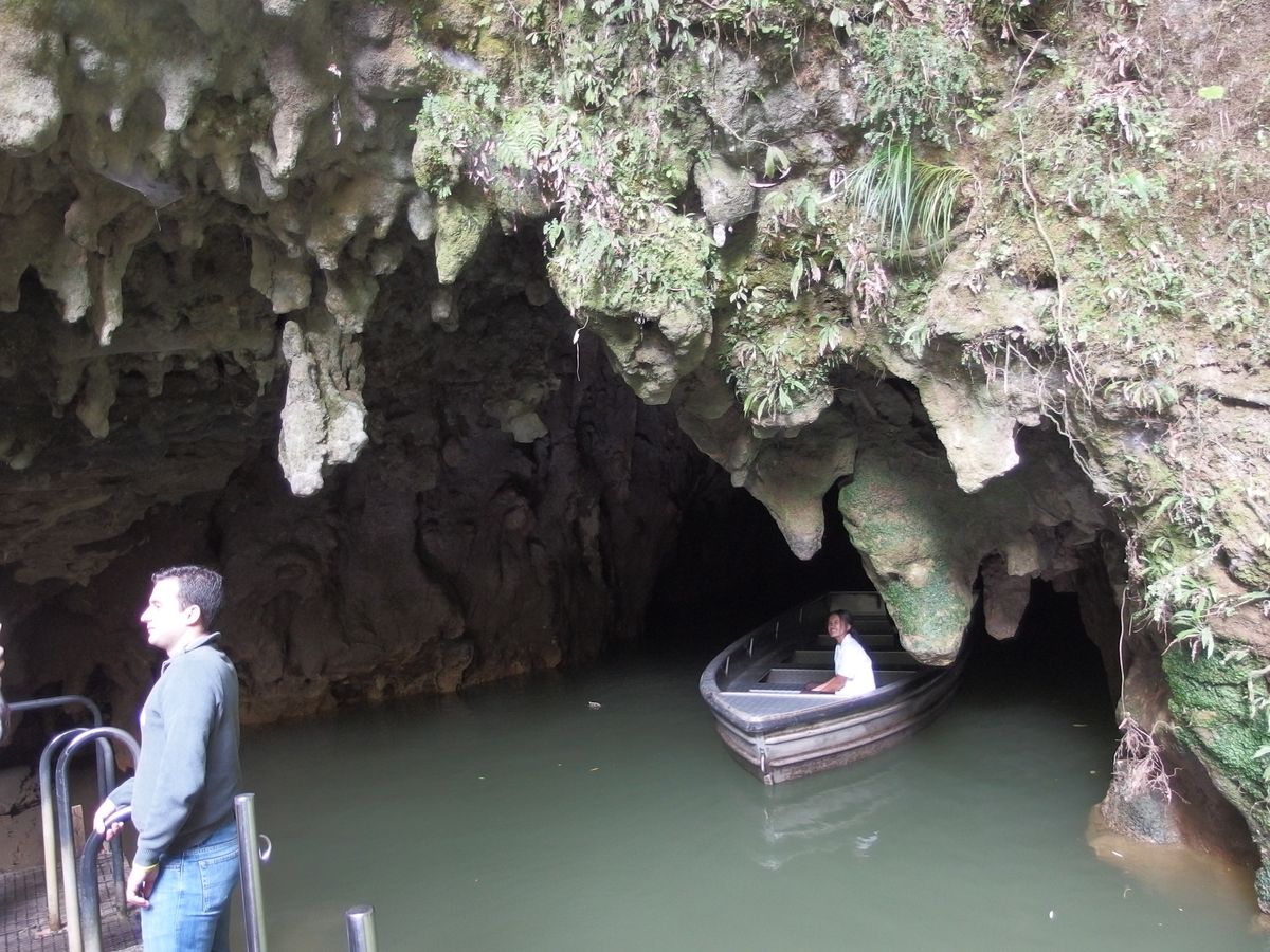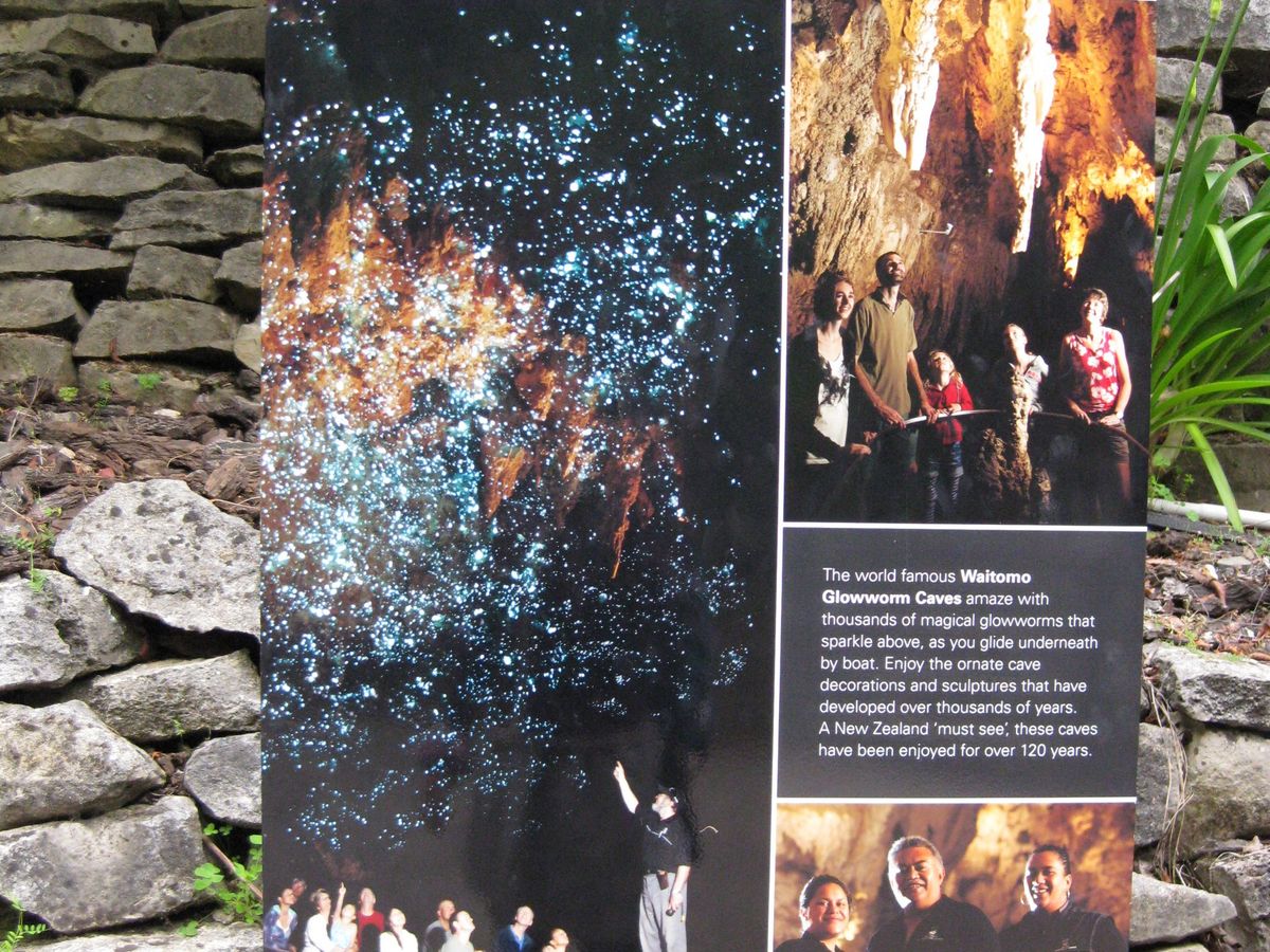 宿泊先でピックアップということでしたが、いきなり迎えの人が20分の遅刻。。 遅れを取り戻そうと、スピードは出すは運転は荒いし。。そんな感じでいきなり印象が悪くスタートしたこのツアーですが、ほぼ定刻で最初の目的地ワイトモに到着。マオリの人の案内で鍾乳洞に入ってボートに乗り込むと満点の星空のような青白い光が、とても幻想的でした。