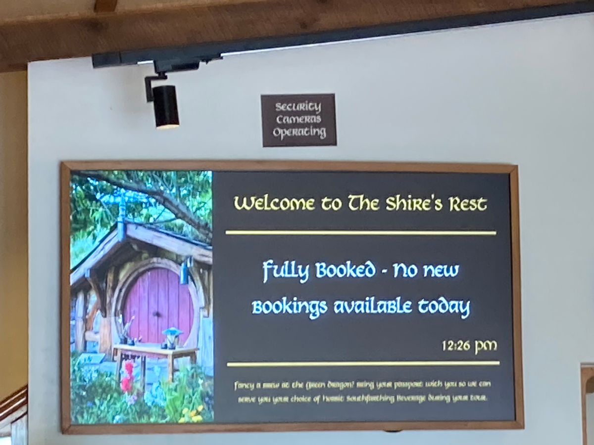 現地の冬の7月に行ったこともあり、観光シーズンではないと思っておりましたが、12:30頃、昼食後のお土産屋を見る時間にThe Shire's Restのチケットオフィスを覗くと液晶ディスプレイに「Fully Booked - no new bookings available today」の表示が(写真)。土曜日だからでしょうか、大人気のようです。