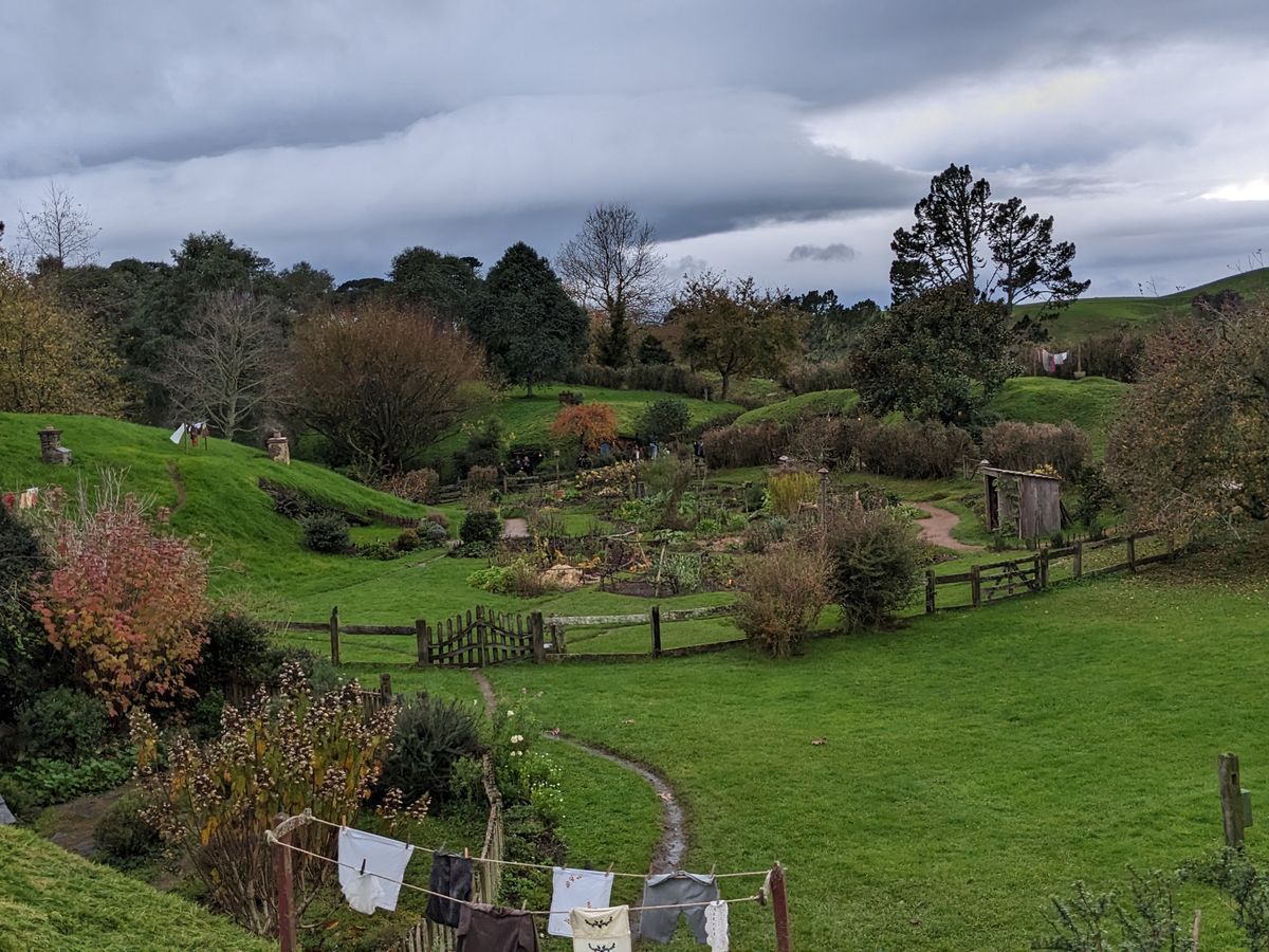 こんな悪天候は初めてですと私たちのガイドさん、日本語で分かりやすく通訳、説明して下さり、飛行機の中で見直した映画のシーンが連想でき楽しめました。また本物と見間違うほどよくできたパンやチーズ、生活道具などがあちこちに現れ、ホビット村にお邪魔している感満載でした。家々の庭にはきれいなかわいらしい花がたくさん咲き、雨の中でも手入れが行き届いているのがよくわかりイングリッシュガーデンのよう!と、お花大好きの私にはたまりませんでした。雨でなければ・・とも思いましたが自然のなせること、最後まで降り続いた雨ですがこれはこれで思い出深い旅の一つとなりました。帰りは途中から青空、太陽が輝き、みんなで笑いました。嵐のホビット村、一生忘れないでしょう!!