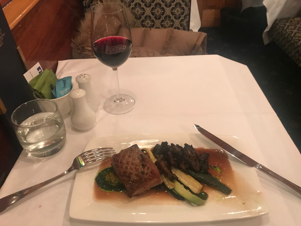 トラムに乗ってのお食事は、とても貴重な体験でした。当日は、様々な国からのお客様で満席のようでしたが、スタッフの方々が一組、一組、丁寧に接してて下さいました。8年前に起こった地震から復興途上にあるクライストチャーチの街並みですが、トラム沿線のお店でお酒やお食事を楽しむ人々の姿見て、こちらも楽しくなりました。お食事もニュージーランドワインも美味しかったです。お肉料理とデザートはボリューム満点でした。夕暮れとともに走る車内の雰囲気も素敵でした。