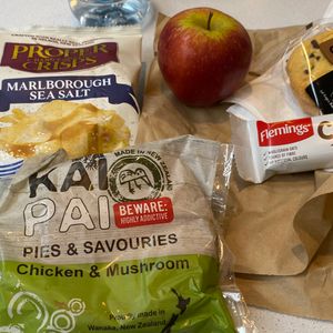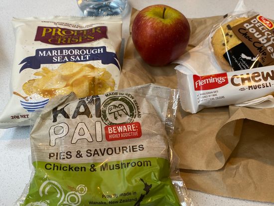 昼食はパイ、クッキー、ミューズリーバー、ポテトチップス、リンゴです。船内で飲み物はコーヒーサーバーからセルフでフリーで飲めますが、バス内にはありませんのでペットボトルなどを持ち込んだ方が良いと思います。