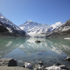 前日の雪模様も一転、当日は雲一つない快晴となったフッカー・バレー・トラックハイキング、多少の残雪による雪景色と、山や空の鮮やかな色のコントラストがとても綺麗で気持ちのよいものでした。