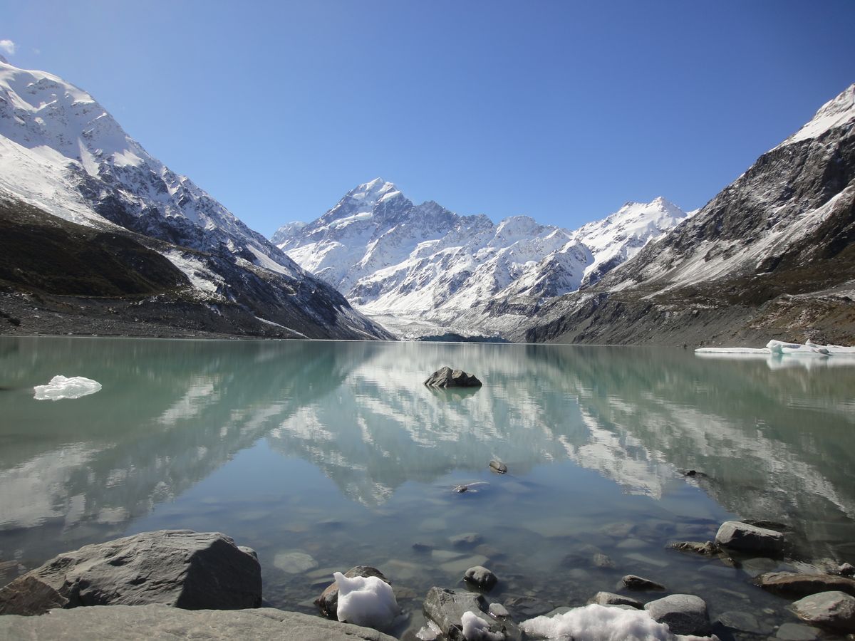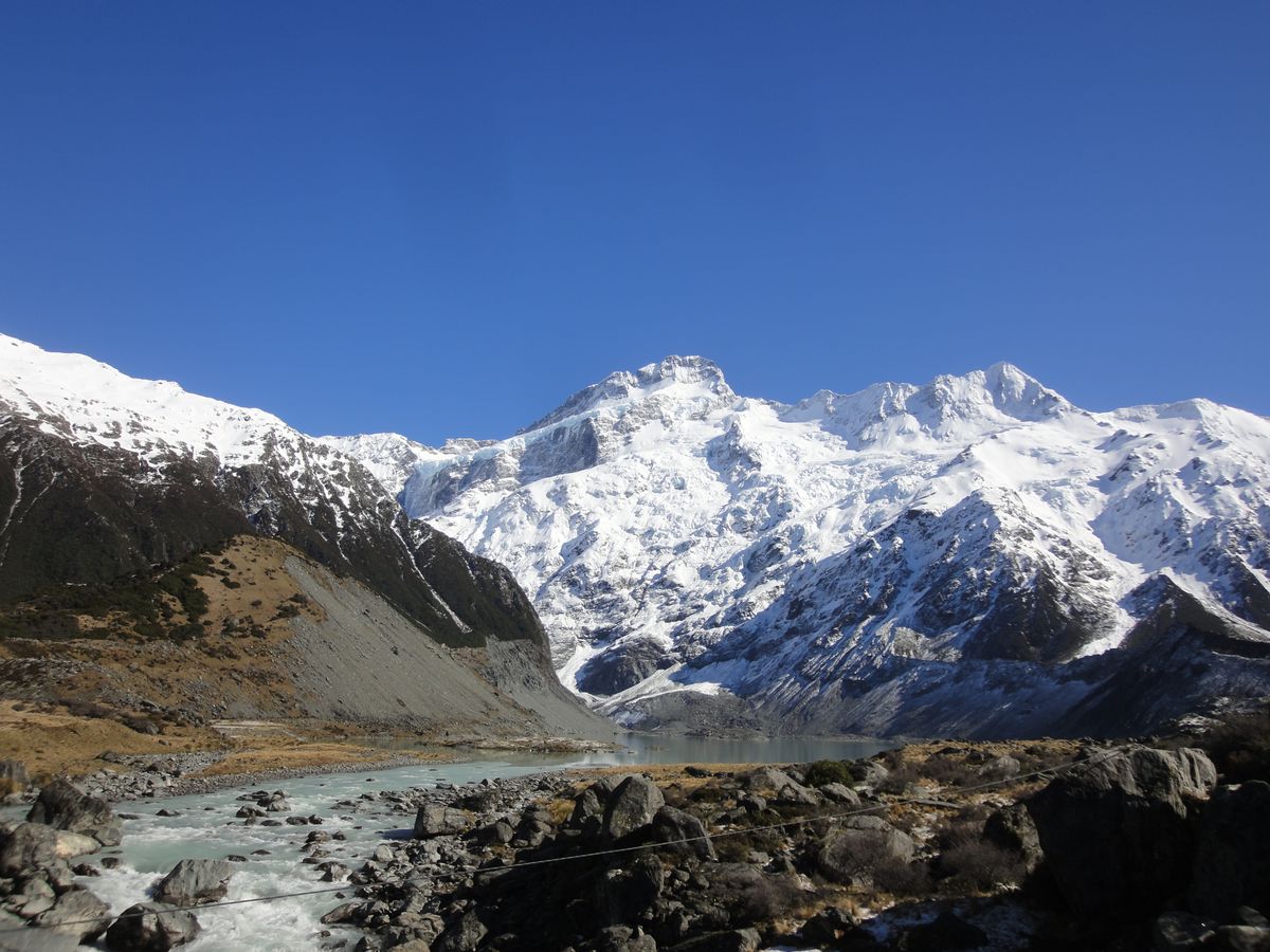前日の雪模様も一転、当日は雲一つない快晴となったフッカー・バレー・トラックハイキング、多少の残雪による雪景色と、山や空の鮮やかな色のコントラストがとても綺麗で気持ちのよいものでした。